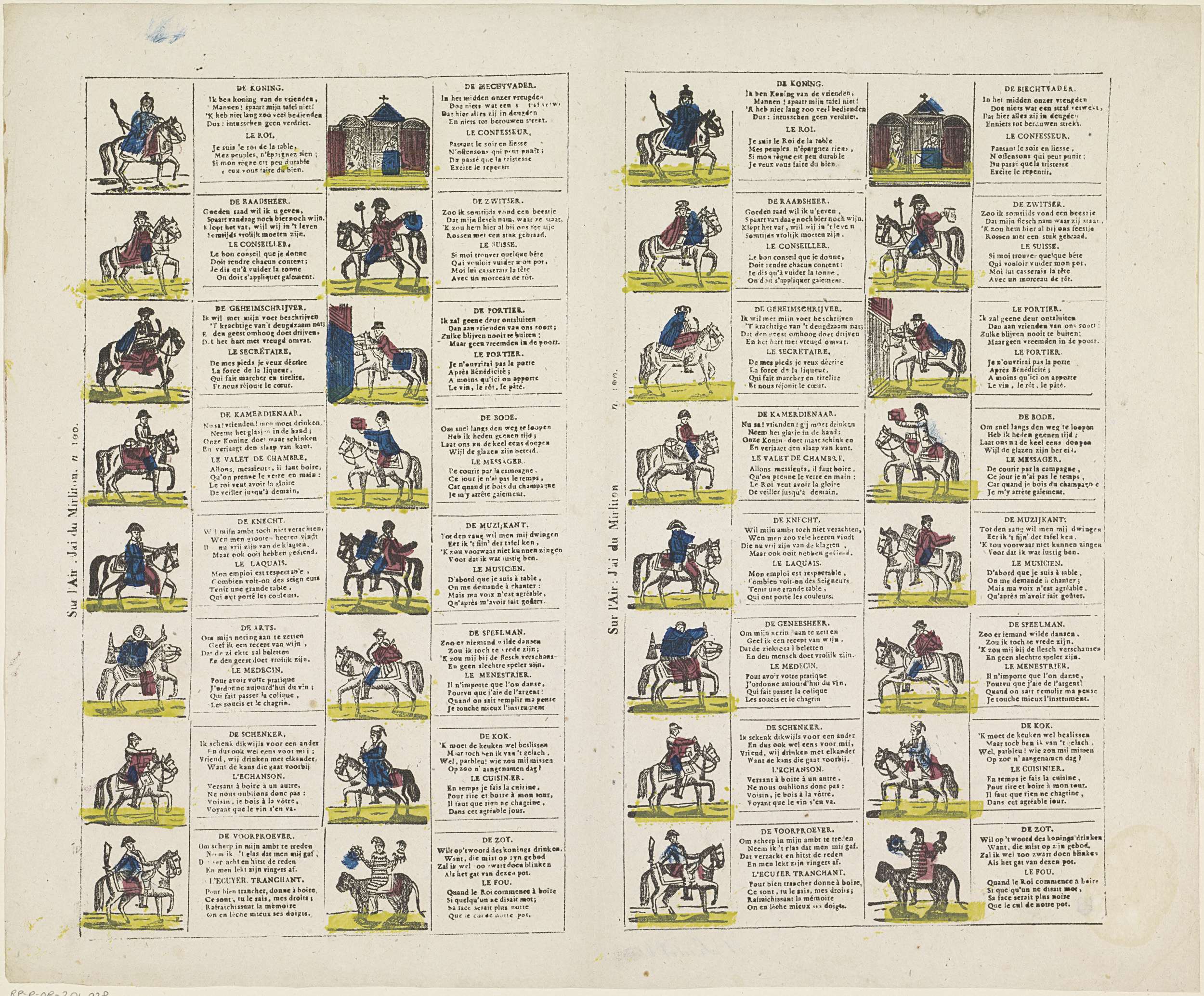 Blad met 32 voorstellingen (driekoningenbriefjes) van verschillende functies binnen het hof, waaronder een raadsman, een proever en een portier. Rechts naast elke afbeelding een vierregelig vers in het Nederlands en in het Frans. Genummerd midden links: n 100.