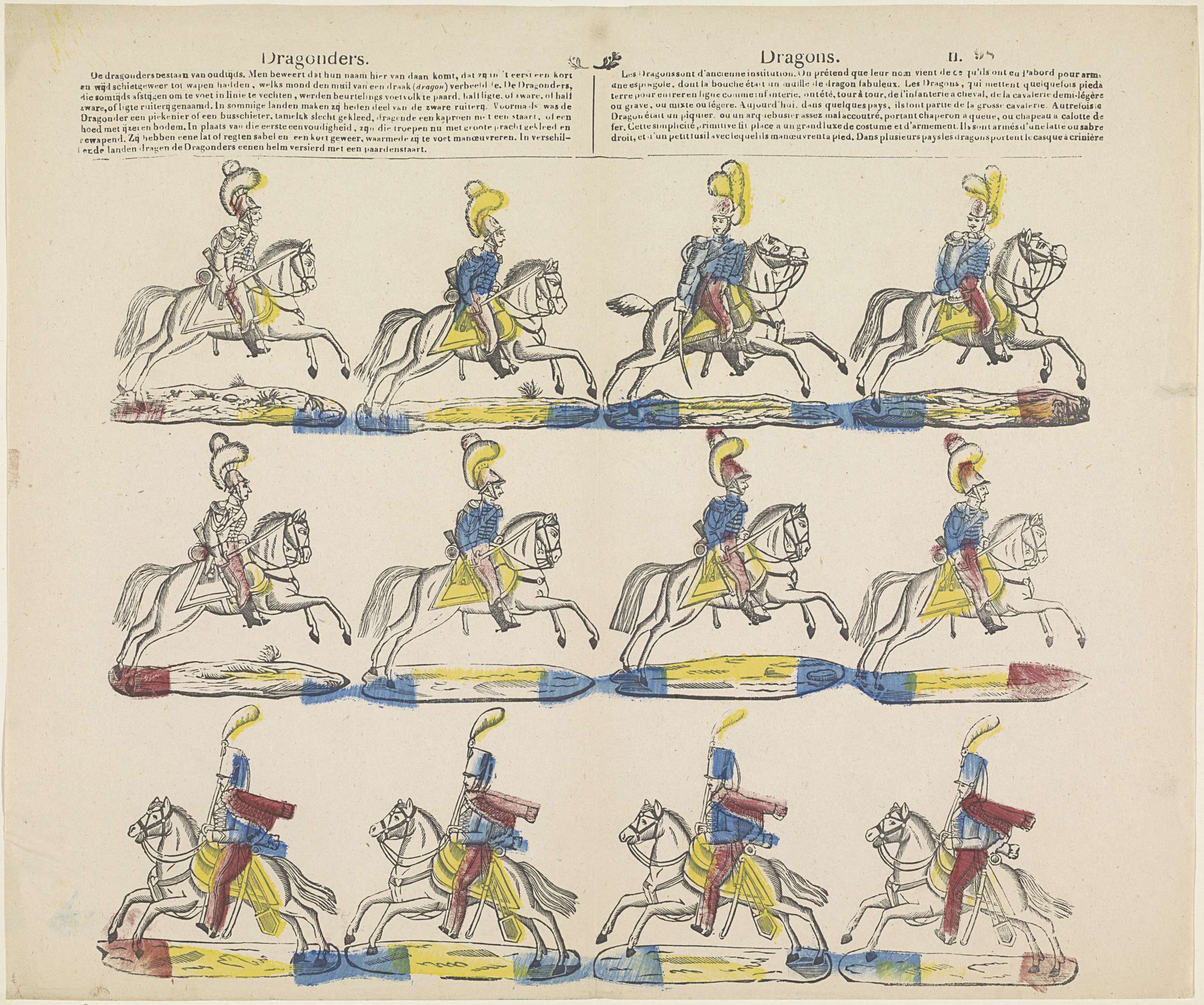 Blad met 3 horizontale rijen met voorstellingen van militairen te paard. Bovenschrift in het Nederlands en in het Frans in twee kolommen. Genummerd rechtsboven: n. 98.