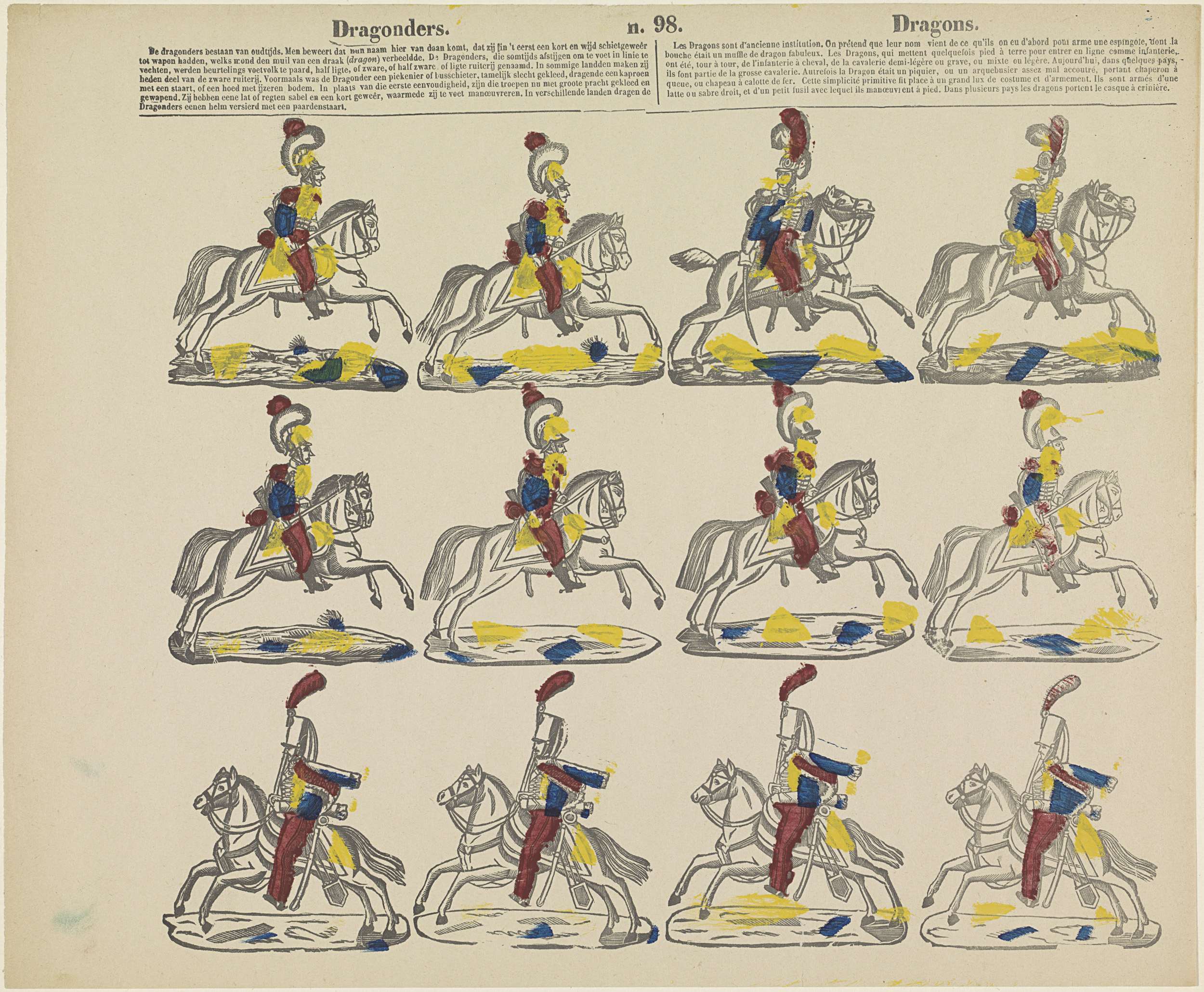 Blad met 3 horizontale rijen met voorstellingen van militairen te paard. Bovenschrift in het Nederlands en in het Frans in twee kolommen. Genummerd midden boven: n. 98.