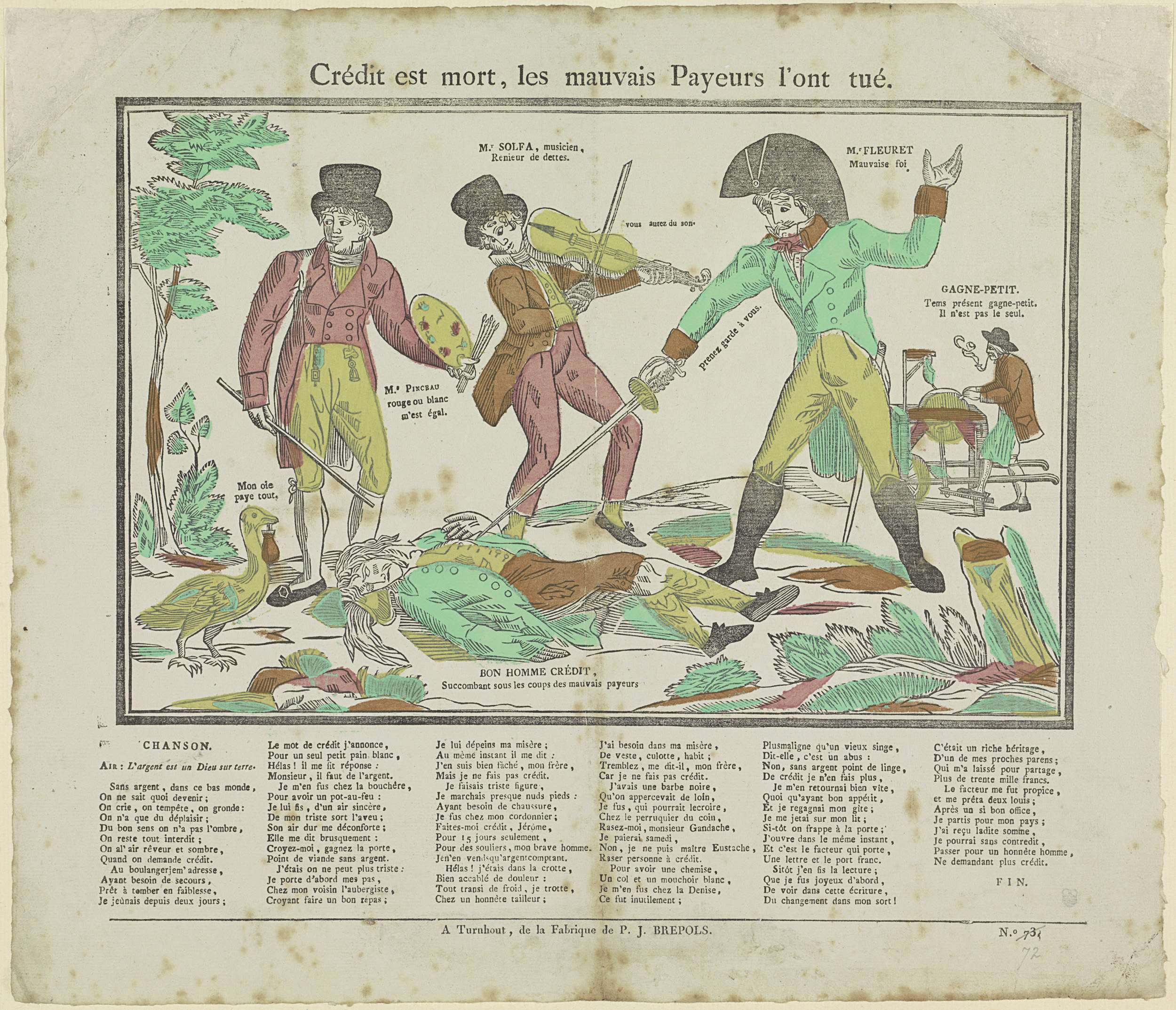 De dood van Krediet, door wanbetalers. Het dode lichaam van Krediet ligt op de grond. Om zijn lichaam staan een gans, een schilder, een violist en een schermer. Onder elke afbeelding een Frans vers in zes kolommen. Genummerd rechtsonder: No. 73.
