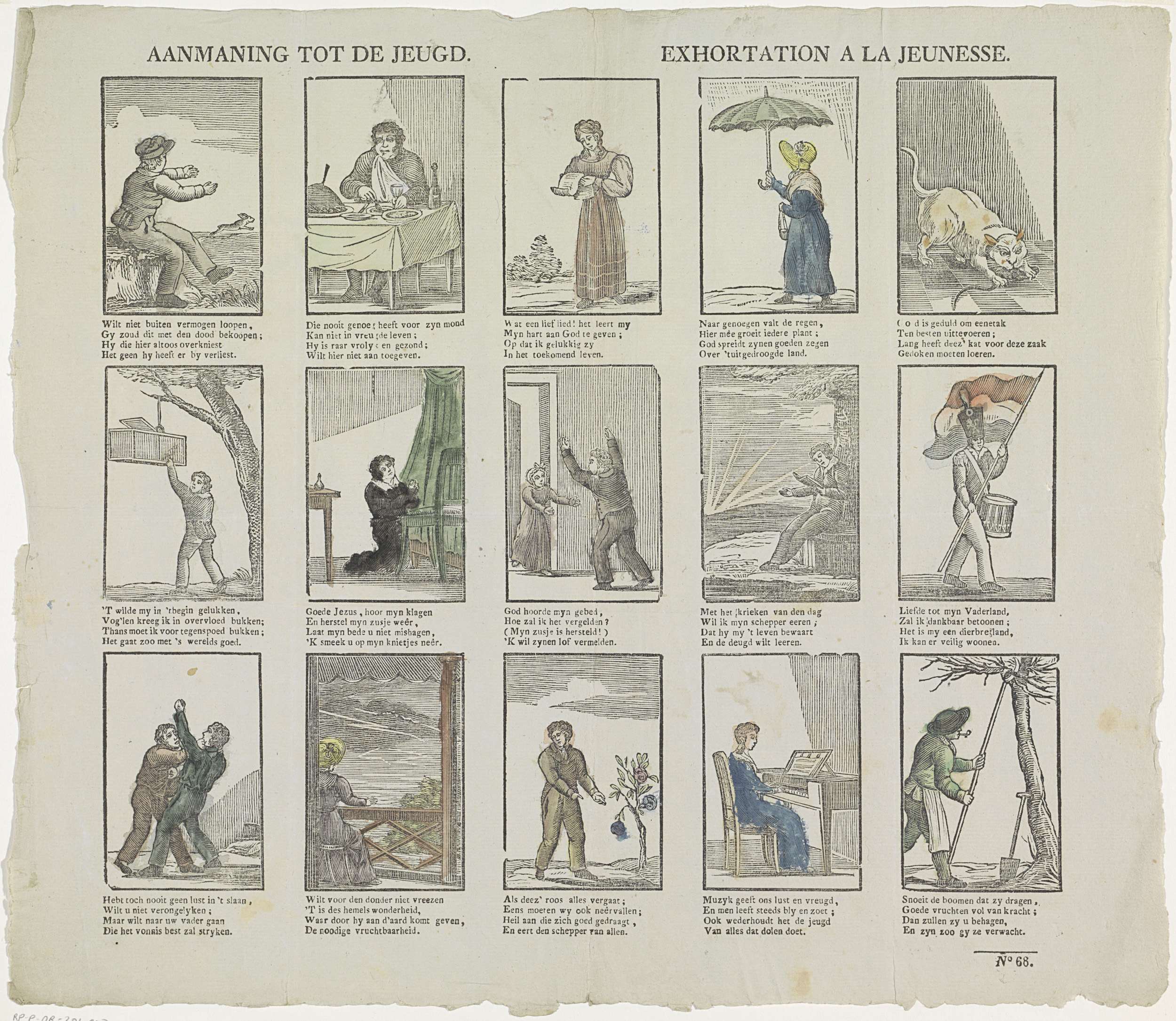 Blad met 15 voorstellingen van verschillende figuren en bezigheden, waaronder een vrouw met paraplu, een kat die een muis vangt en een vrouw die piano speelt. Onder elke voorstelling een vierregelig vers. Genummerd rechtsonder: No 68.