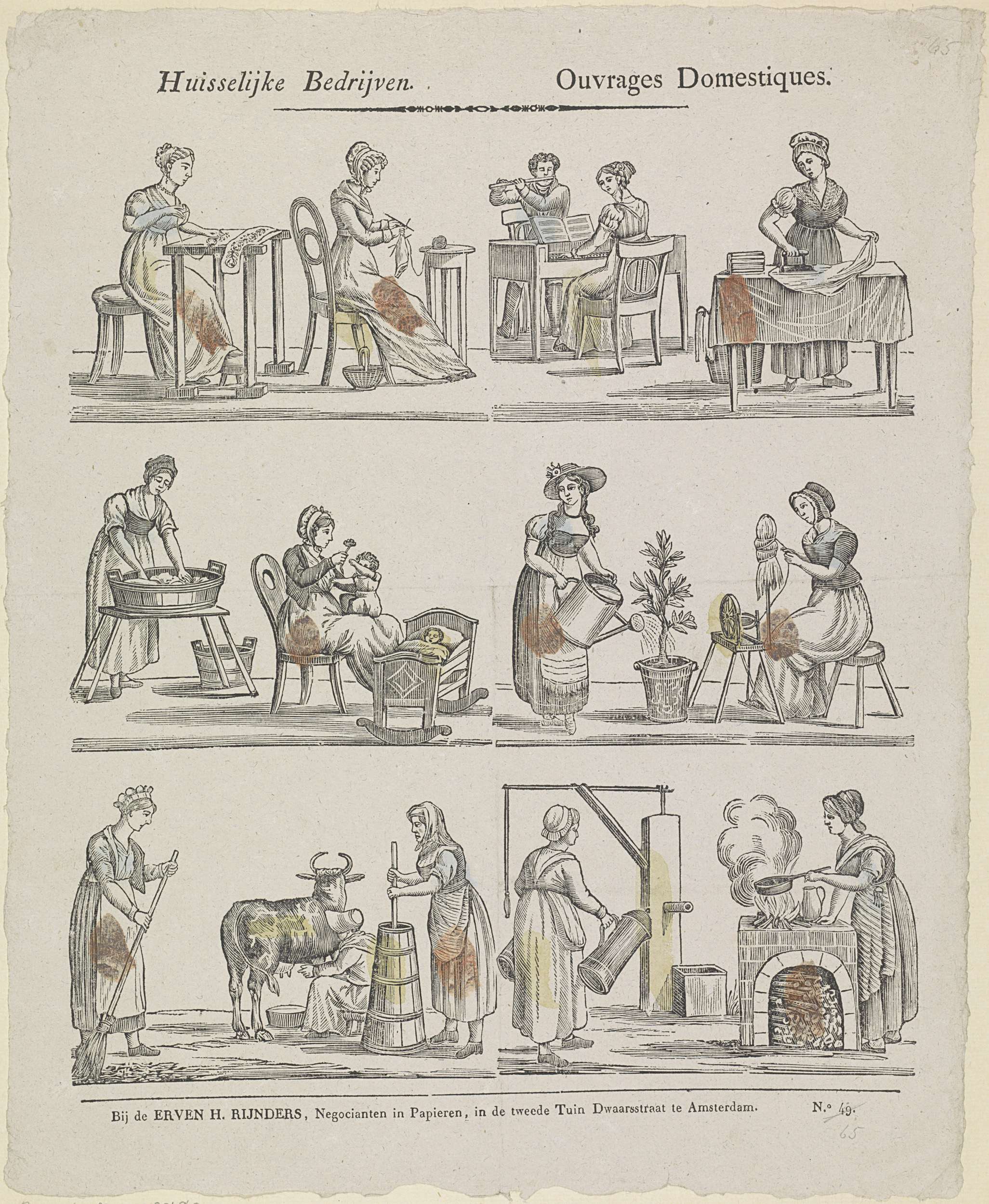 Blad met 3 horizontale rijen met in totaal 12 voorstellingen van huishoudelijke taken, waaronder naaien, strijken en koken. Genummerd rechtsonder: No. 49.