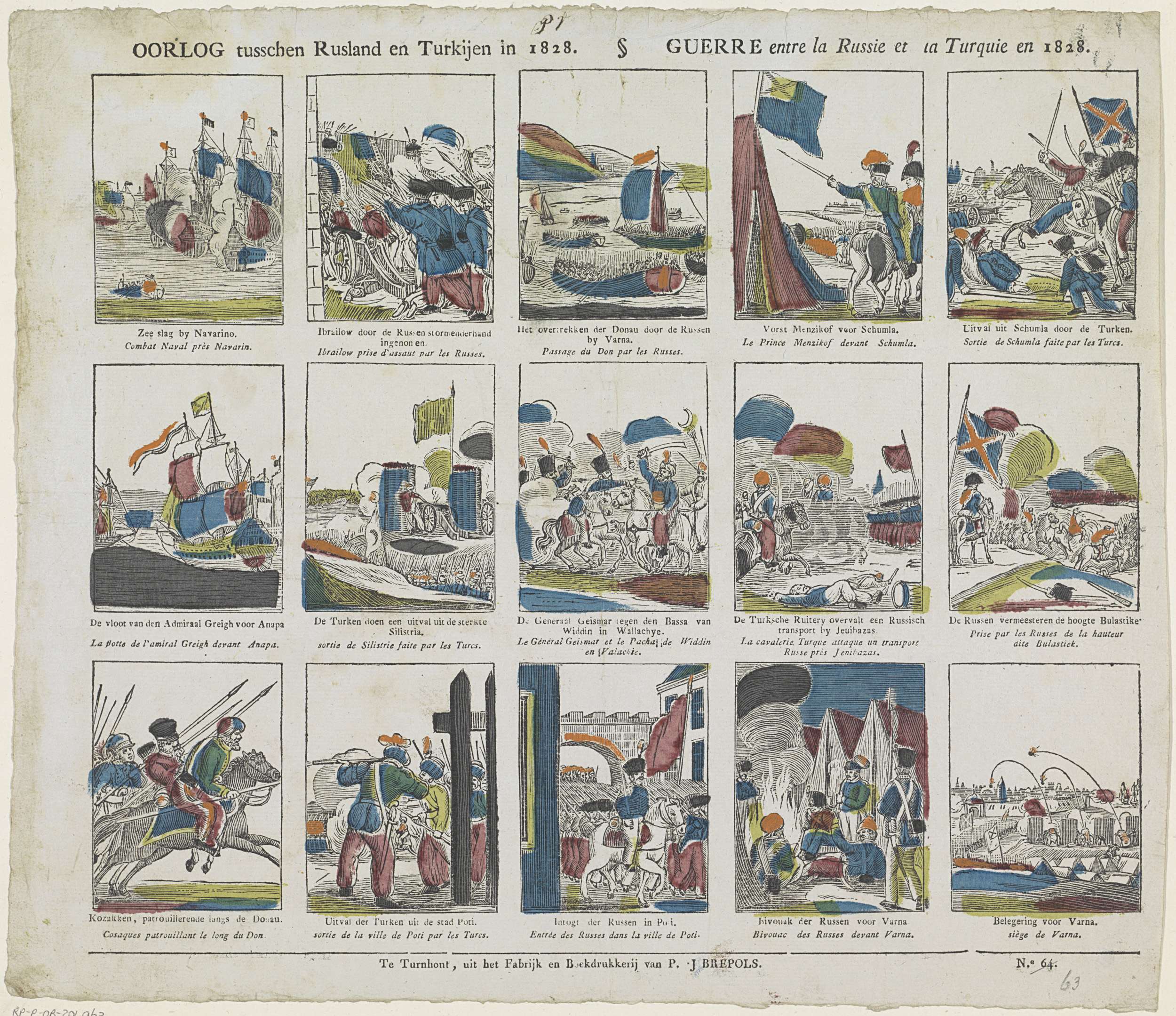 Blad met 15 voorstellingen van de oorlog tussen Rusland en Turkije in 1828. Onder elke afbeelding een onderschrift in het Nederlands en in het Frans. Genummerd rechtsonder: No. 64.