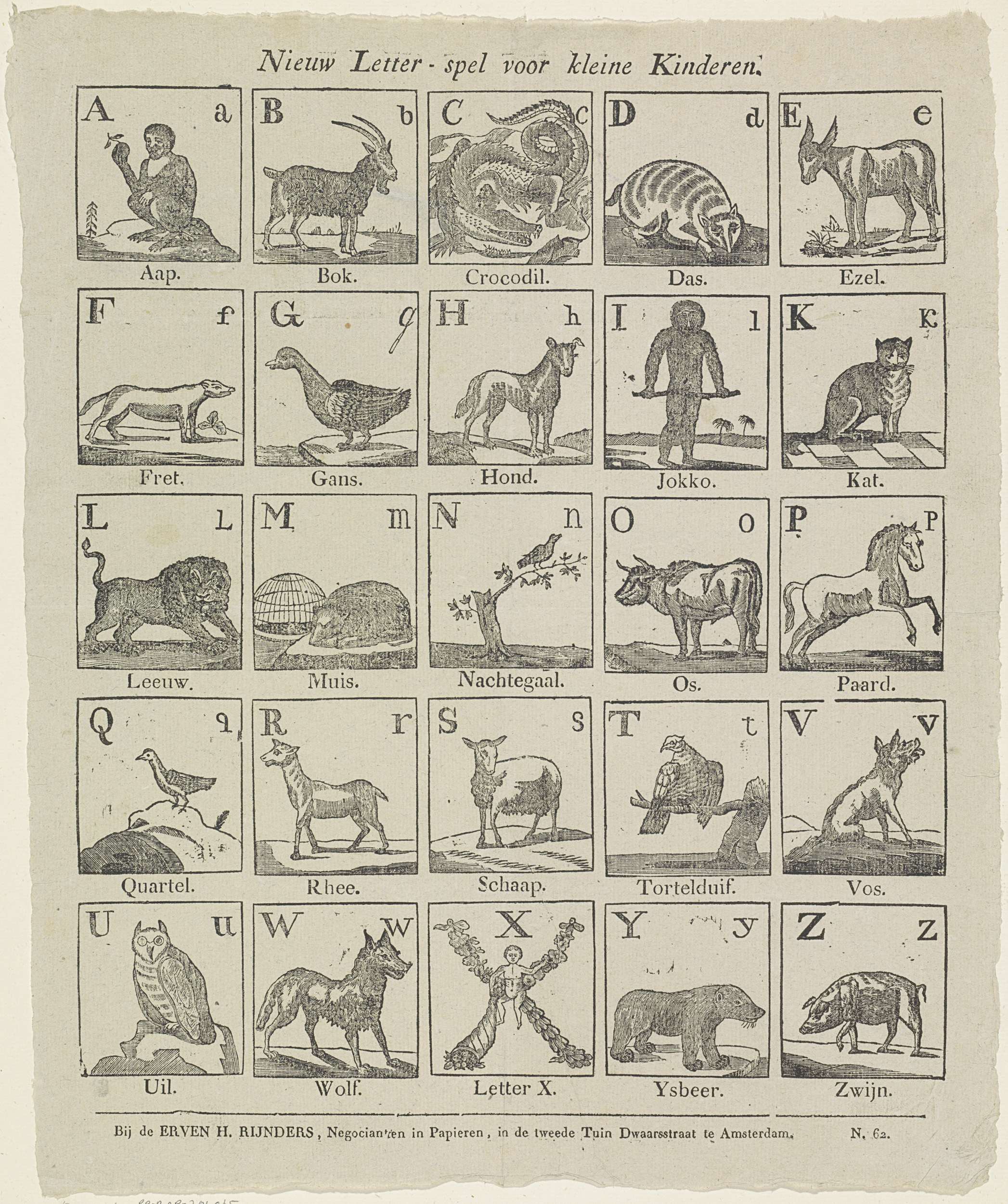 Blad met 25 voorstellingen van de letters van het alfabet geïllustreerd met dieren waarvan de woorden met de betreffende letter beginnen. Onder elke afbeelding een onderschrift. Genummerd rechtsonder: N. 62.