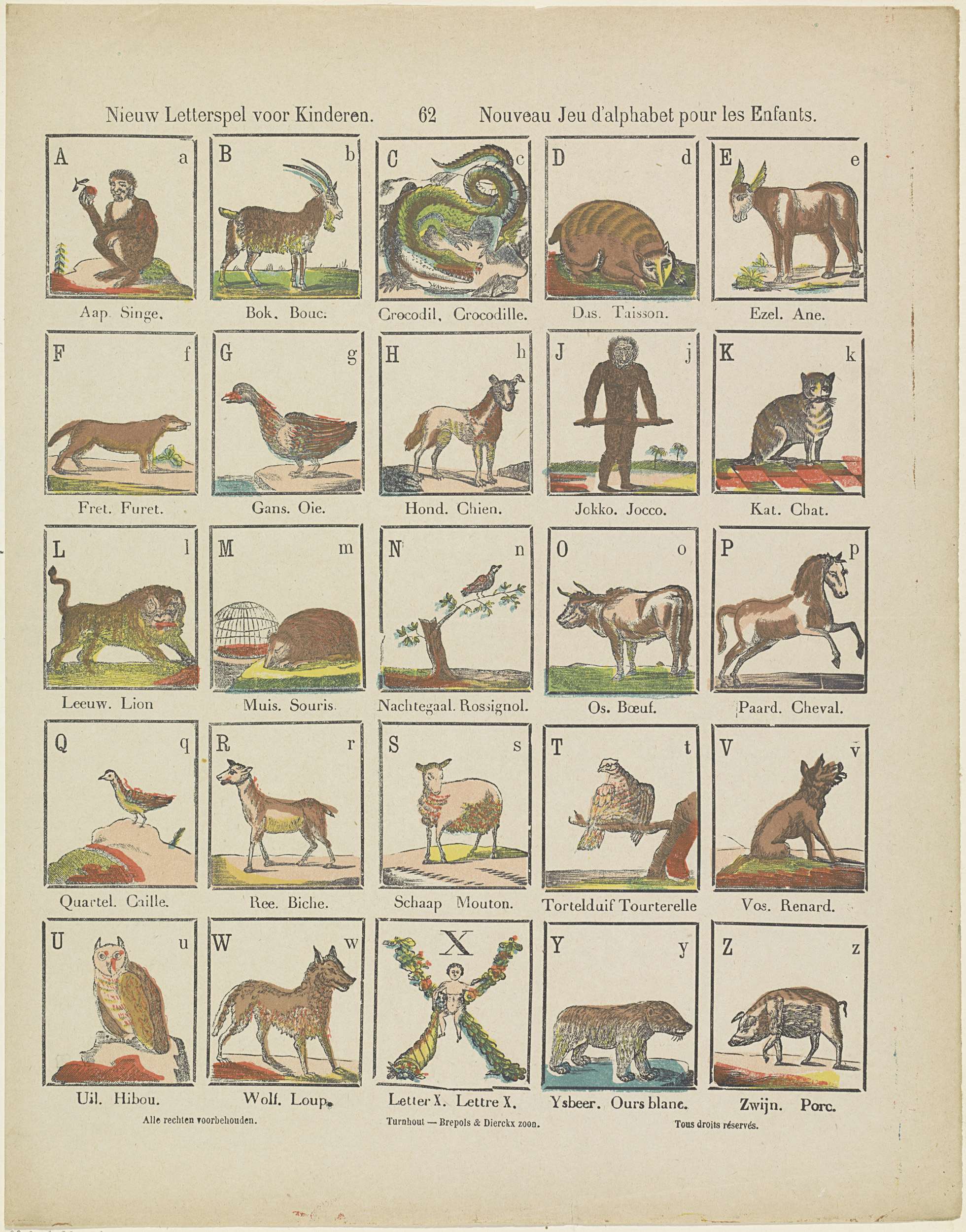Blad met 25 voorstellingen van de letters van het alfabet geïllustreerd met dieren waarvan de woorden met de betreffende letter beginnen. Onder elke afbeelding een onderschrift. Genummerd middenboven: 62.