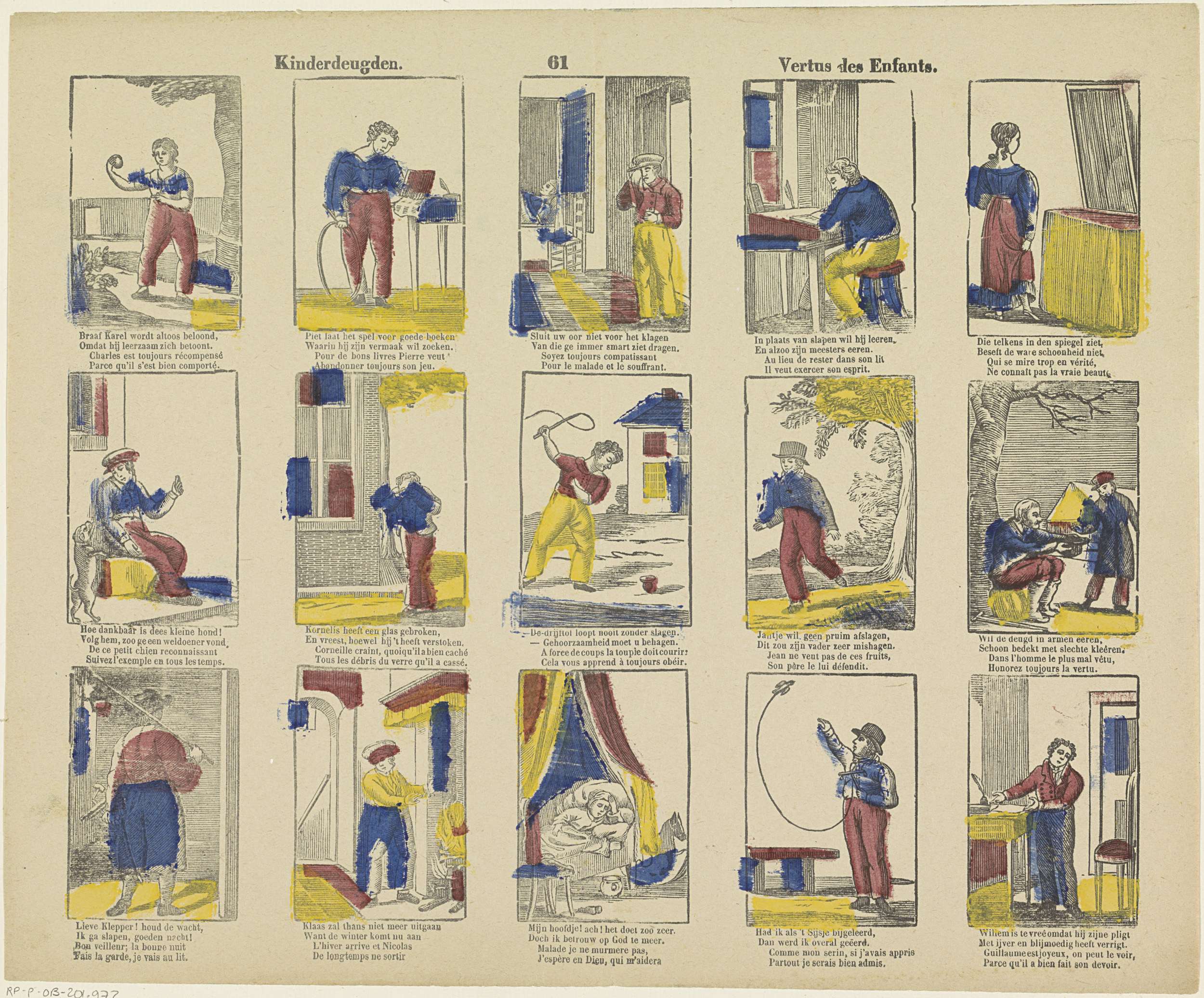 Blad met 15 voorstellingen van kinderspelen en bezigheden, waaronder lezen en tollen. Onder elke afbeelding een tweeregelig vers in het Nederlands en in het Frans. Genummerd midden boven: 61.