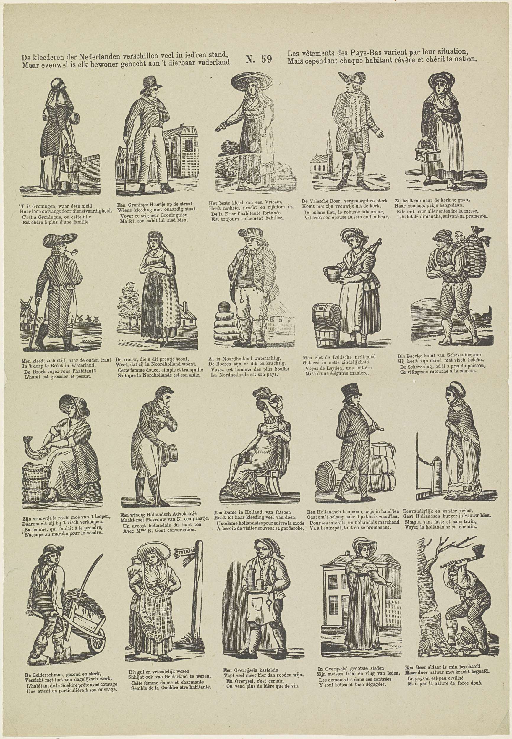 Blad met 20 voorstellingen van personen in verschillende Nederlandse klederdrachten. Onder elke afbeelding een tweeregelig vers in het Nederlands en in het Frans. Genummerd midden boven: N. 59.