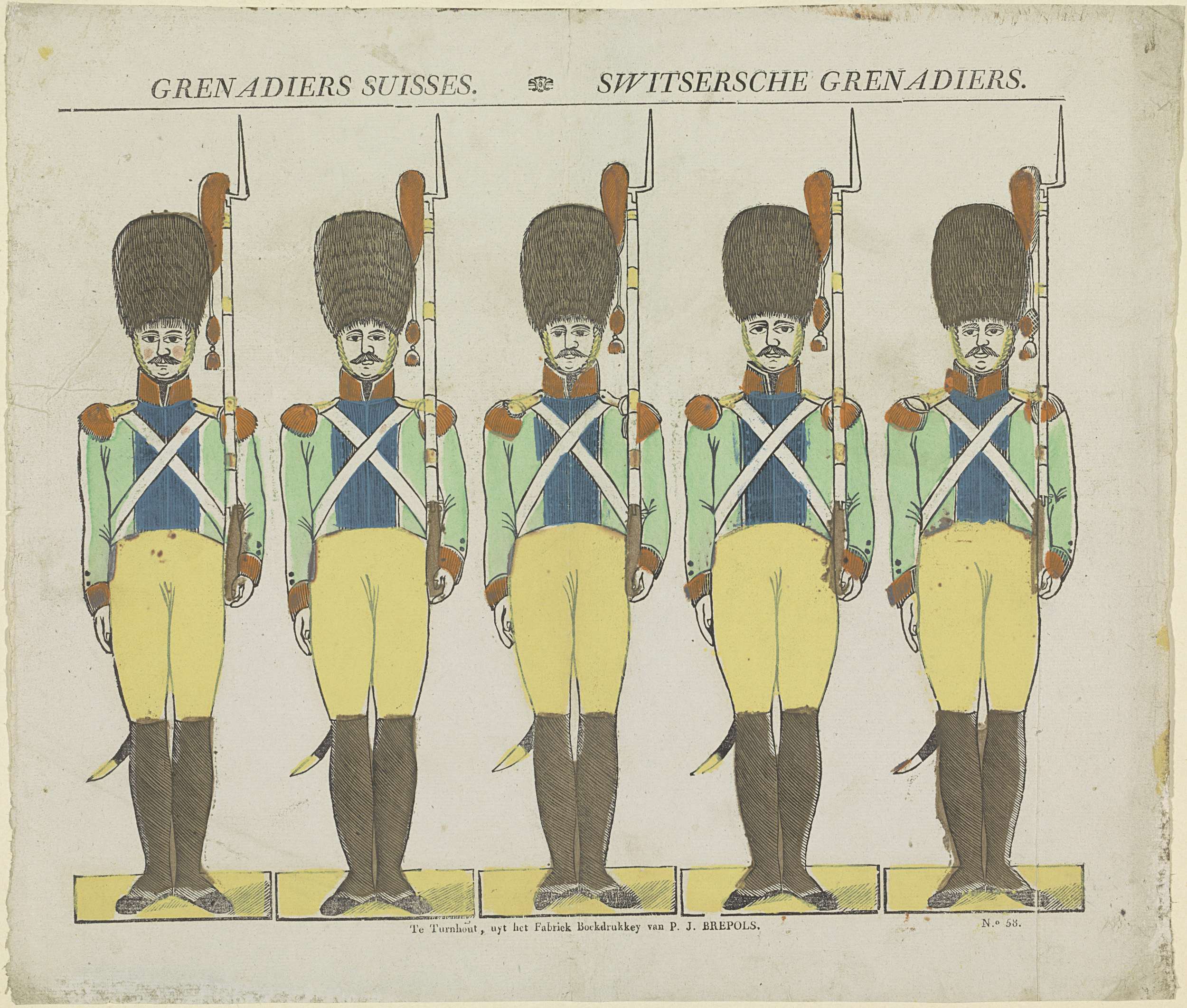 Blad met 5 voorstellingen van Zwitserse militairen. Genummerd rechtsonder: No. 58.