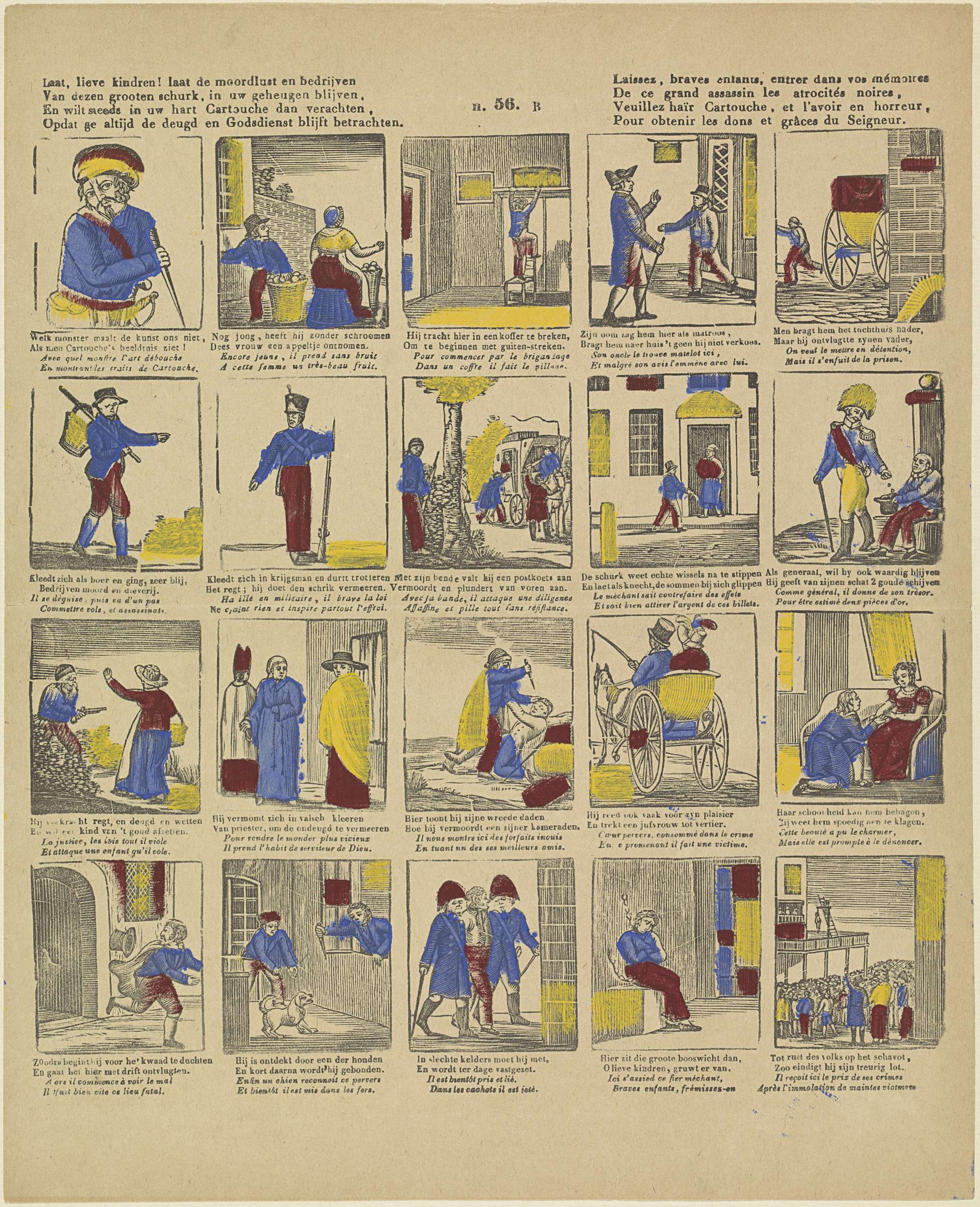 Blad met 20 voorstellingen over het leven en avonturen van Cartouche. Onder elke afbeelding een tweeregelig vers in het Nederlands en in het Frans. Genummerd midden boven: n. 56. B.
