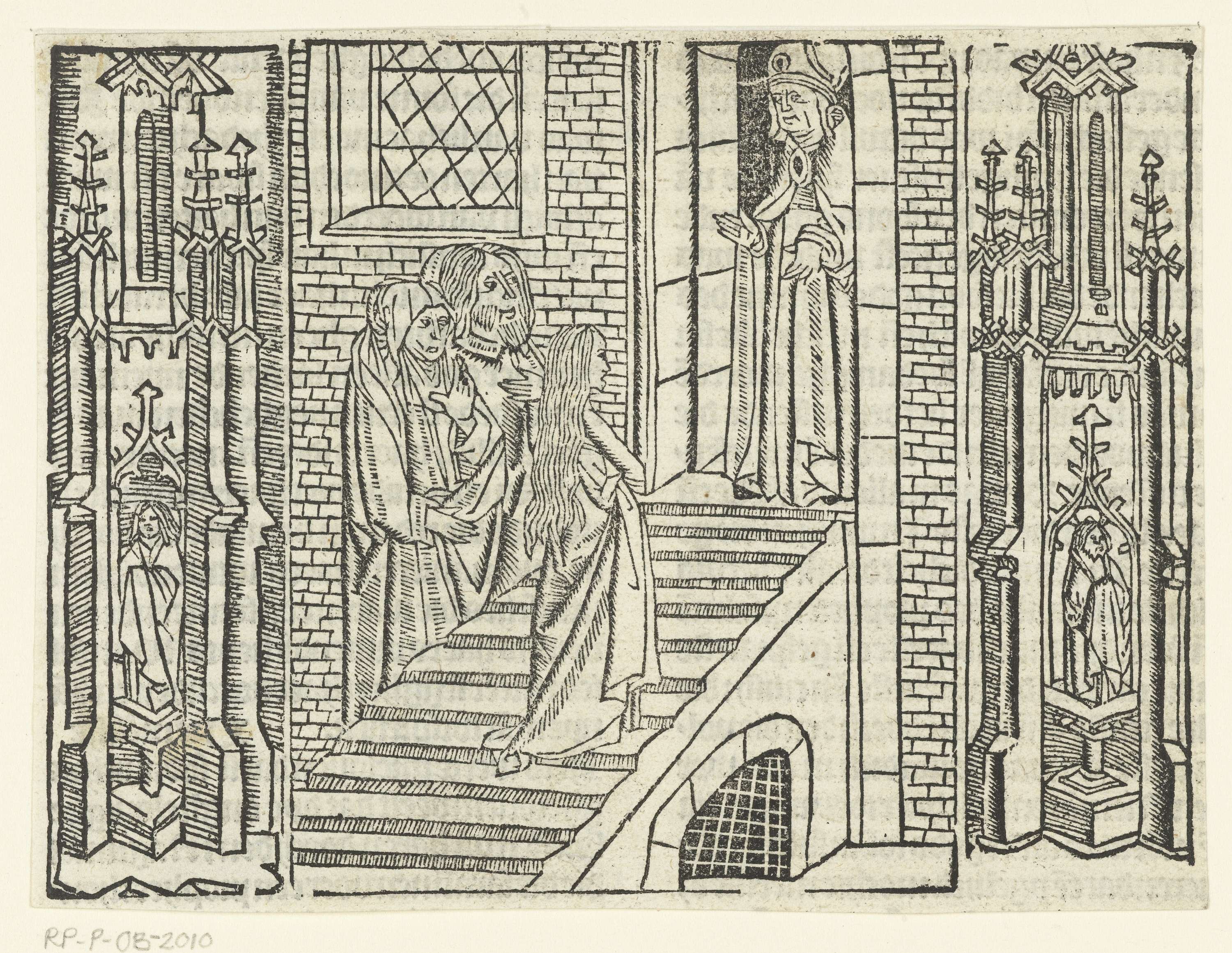 Gedrukt van drie blokken. Maria loopt trap op van tempel richting priester. Anna en Joachim kijken toe. Links en rechts van de voorstelling architectonische ornamentatie.