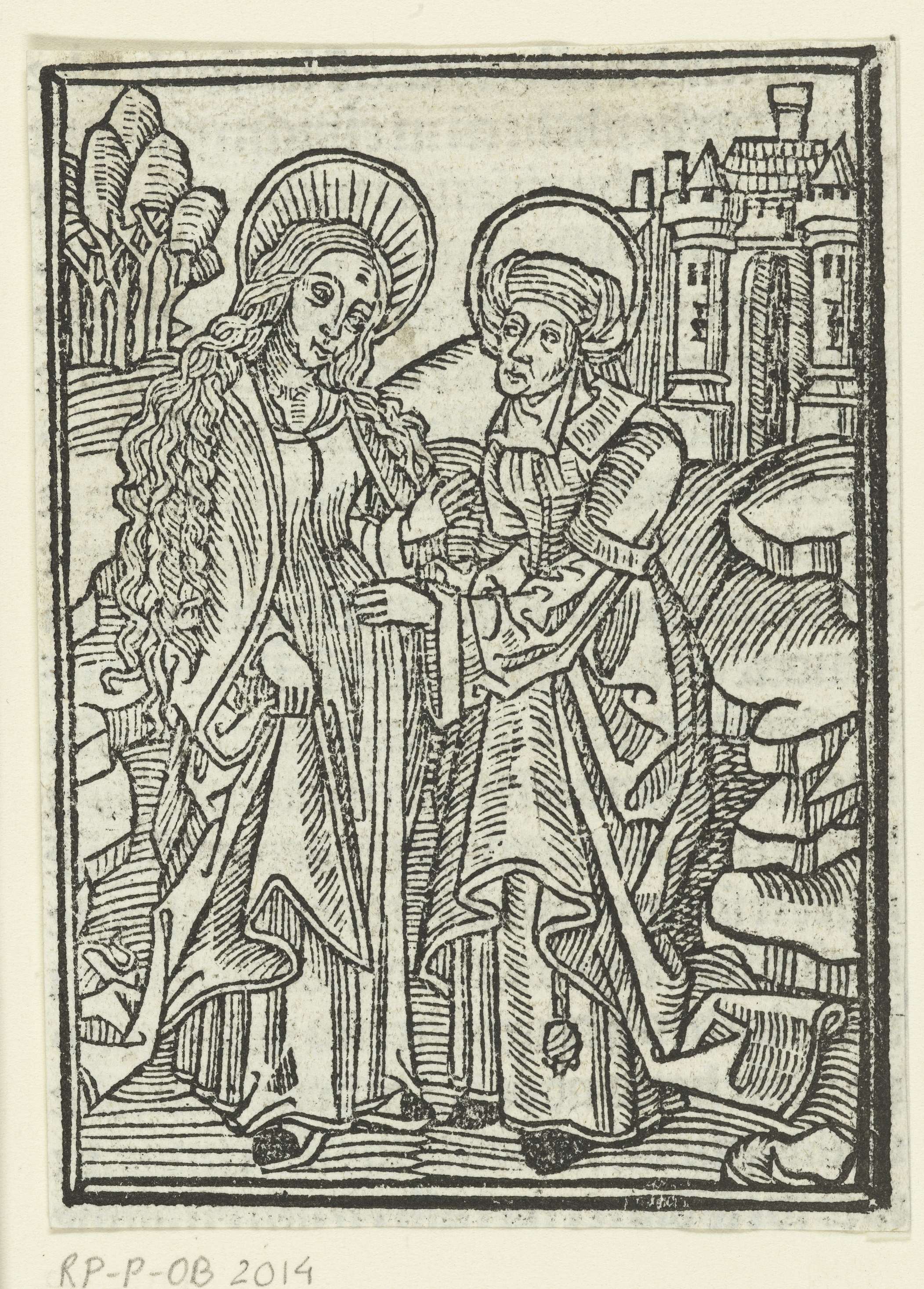 Maria en Elizabeth buiten de stadspoort. Elizabeth heeft hand op buik van Maria.
