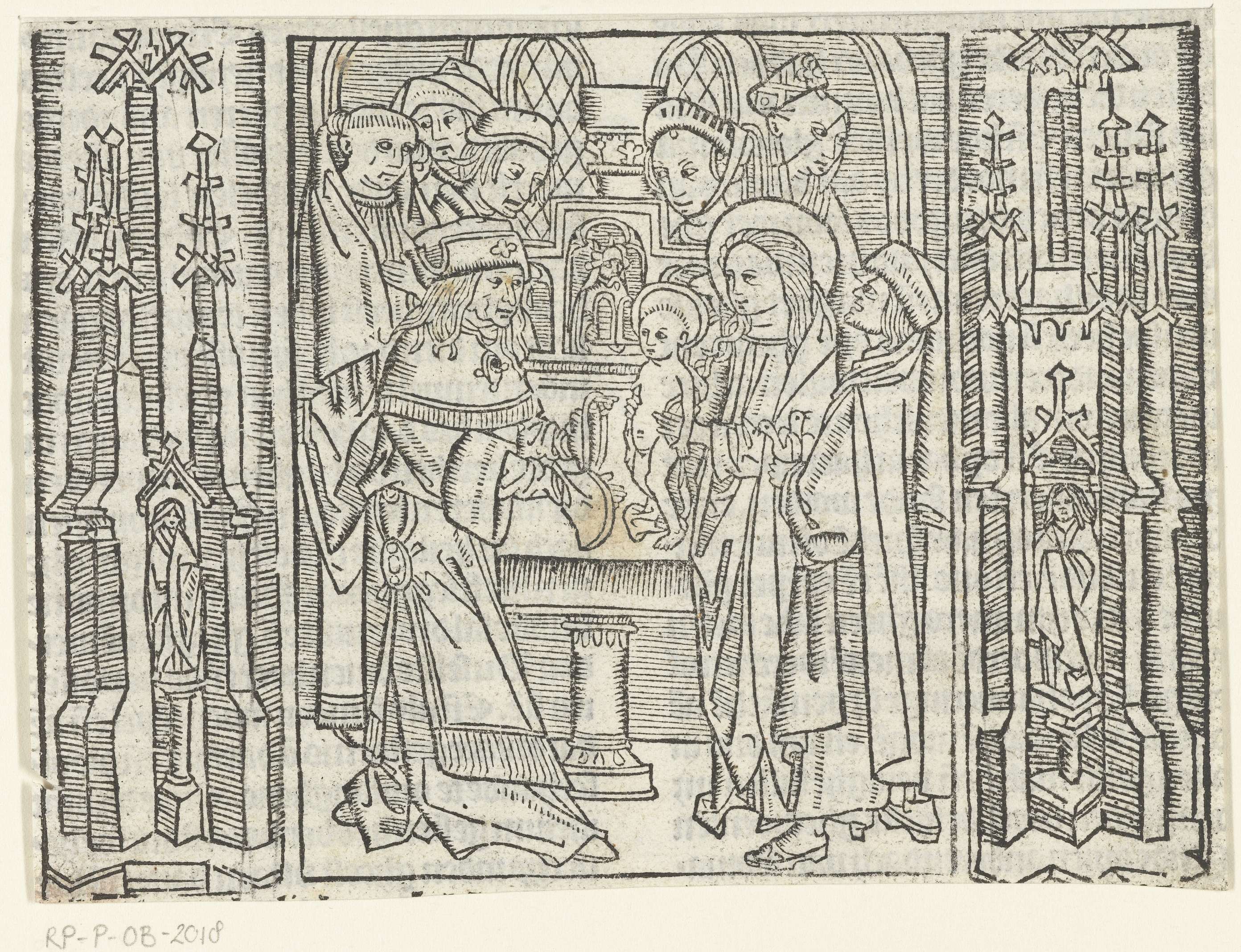 Gedrukt van drie blokken. Maria overhandigt naakt Christuskind aan priester. Omstanders kijken toe. Links en rechts van de voorstelling architectonische ornamentatie.