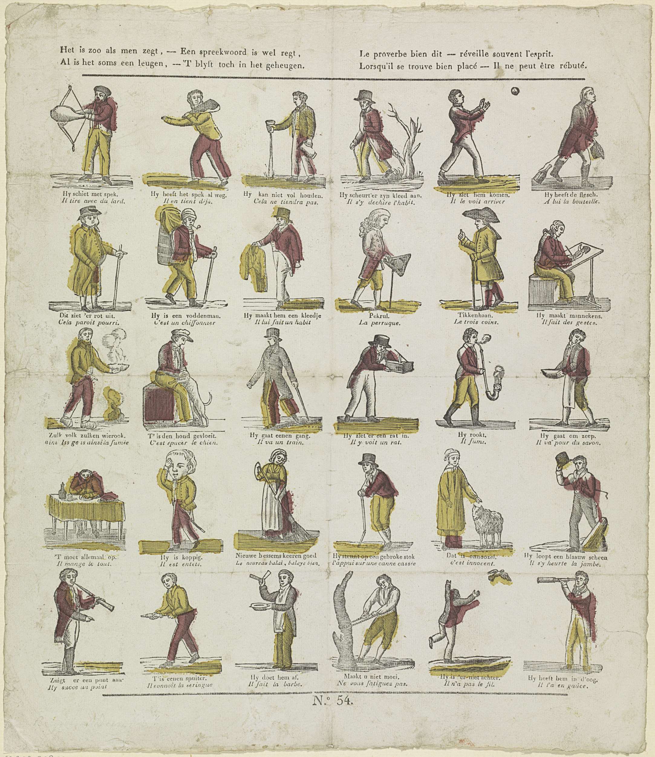 Blad met 30 verbeeldingen van spreekwoorden en uitdrukkingen. Onder elke afbeelding een onderschrift in het Nederlands en in het Frans. Genummerd midden onder: No. 54.