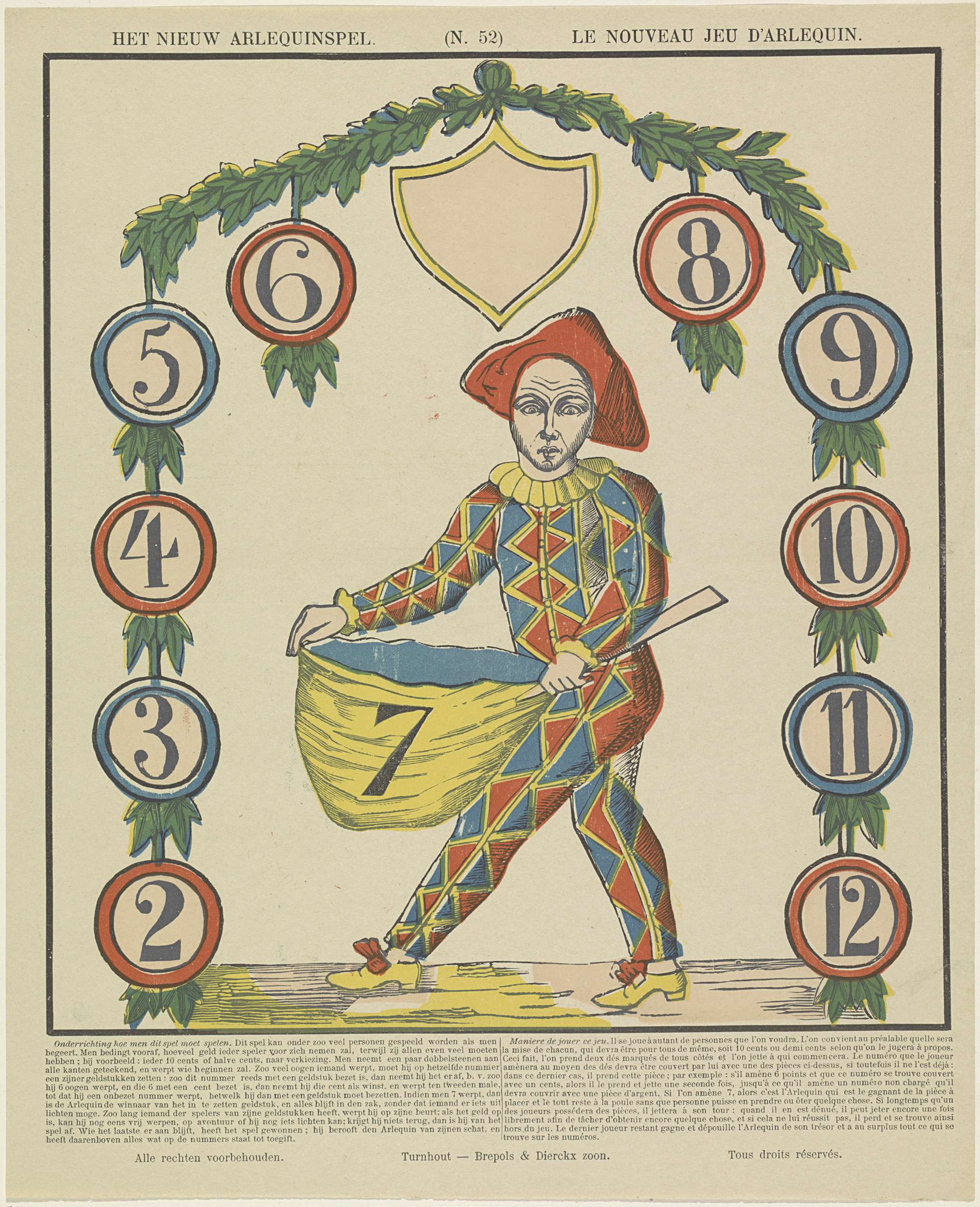Bordspel met in het midden van het speelveld een harlekijn die in zijn geopende handen een zak houdt met daarop het cijfer 7. Rondom hem een guirlande waaraan medaillons hangen met de cijfers 2 tot en met 12. Bovenaan in het midden een schild. Onder de voorstelling de spelregels in het Nederlands en in het ...