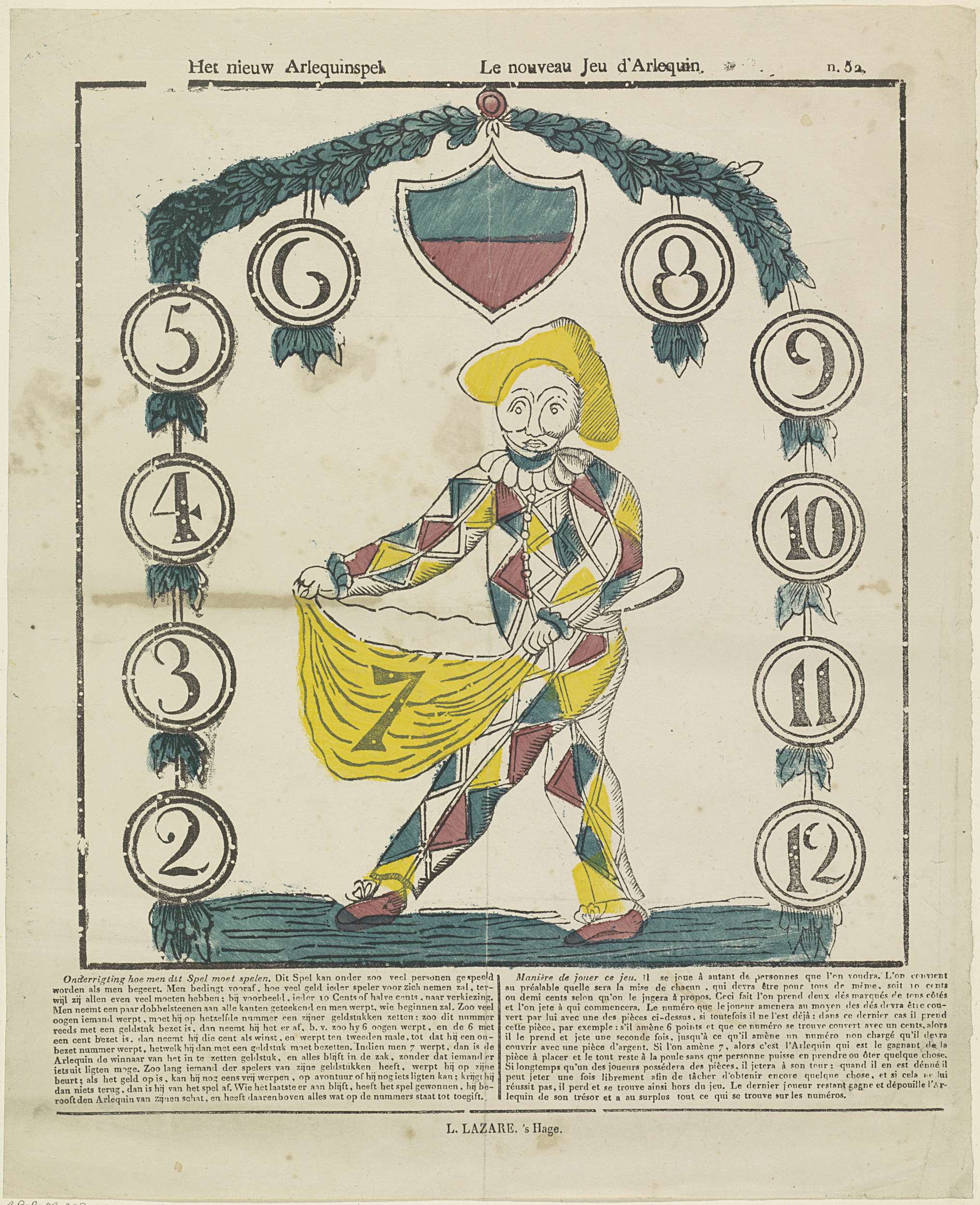 Bordspel met in het midden van het speelveld een harlekijn die in zijn geopende handen een zak houdt met daarop het cijfer 7. Rondom hem een guirlande waaraan medaillons hangen met de cijfers 2 tot en met 12. Bovenaan in het midden een schild. Onder de voorstelling de spelregels in het Nederlands en in het ...