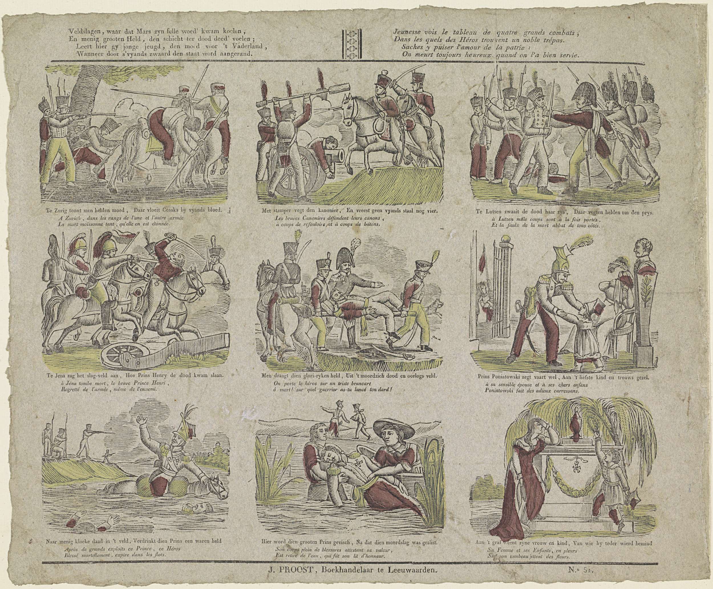 Blad met 9 voorstellingen van de dood van Prins Poniatowski. Onder elke afbeelding een onderschrift in het Nederlands en in het Frans. Genummerd rechtsonder: No. 51.