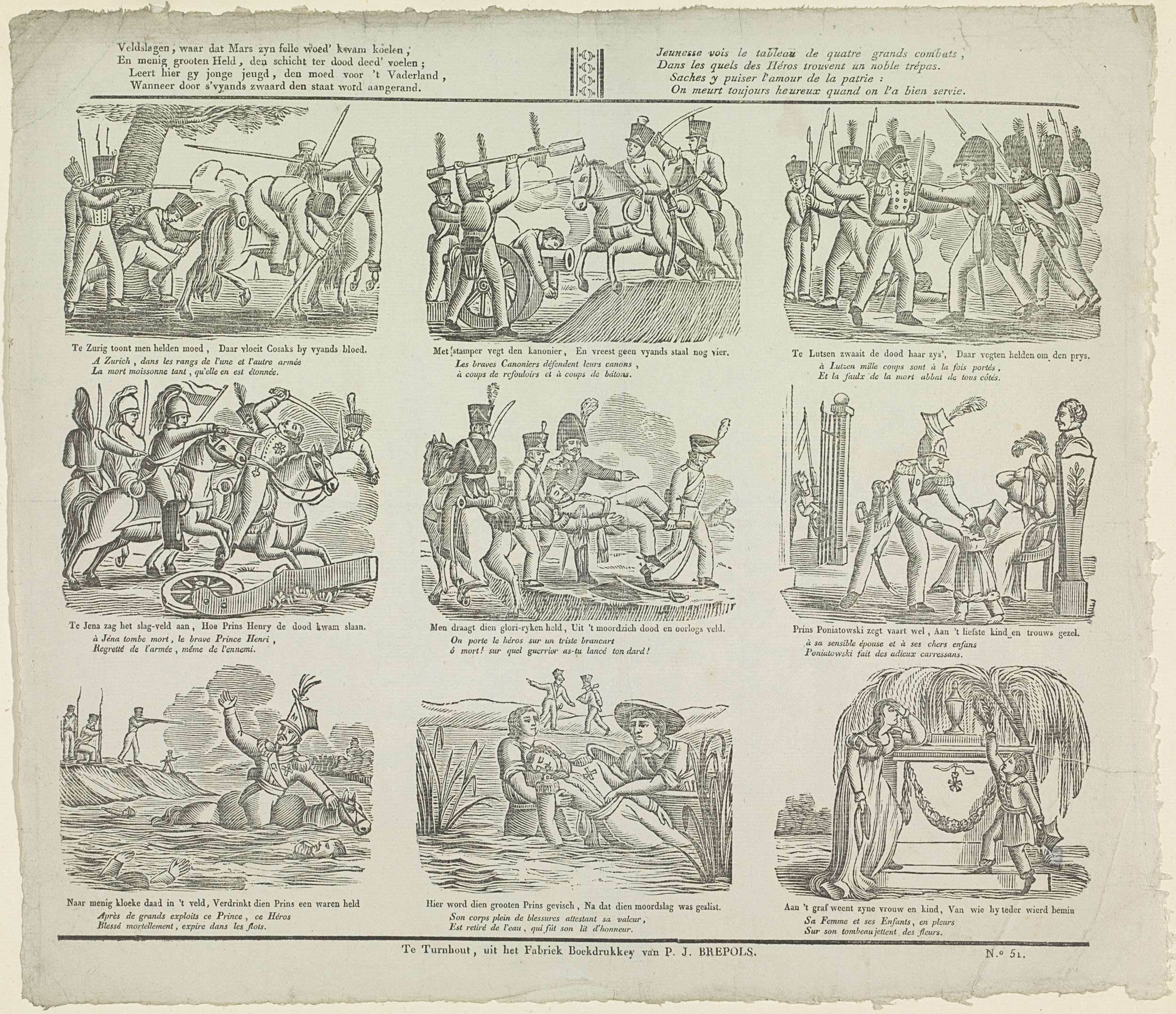 Blad met 9 voorstellingen van de dood van Prins Poniatowski. Onder elke afbeelding een onderschrift in het Nederlands en in het Frans. Genummerd rechtsonder: No. 51.