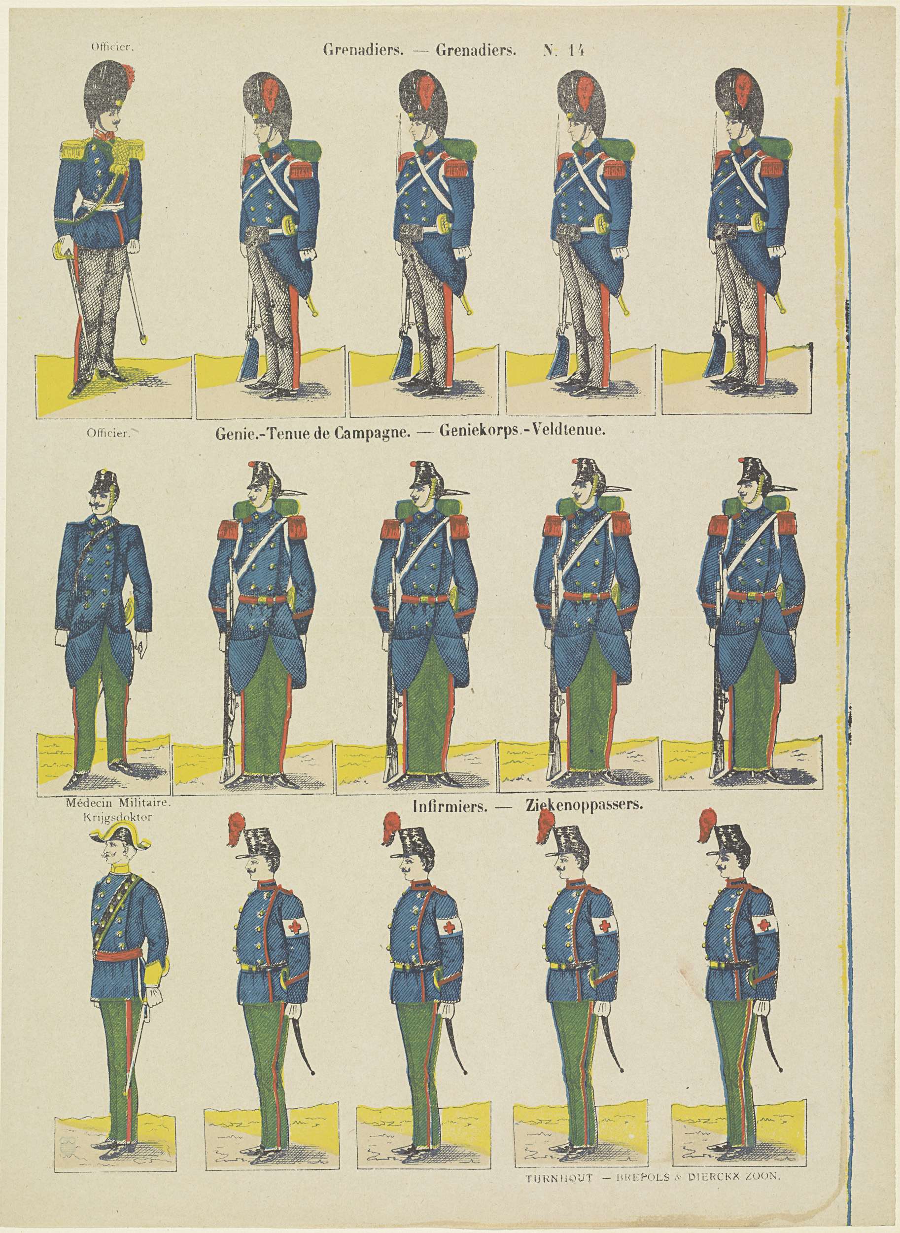 Blad met 3 horizontale rijen met in totaal 15 voorstellingen van officieren, militairen met geweren, een krijgsdokter en ziekenoppassers. Genummerd rechtsboven: N. 14.