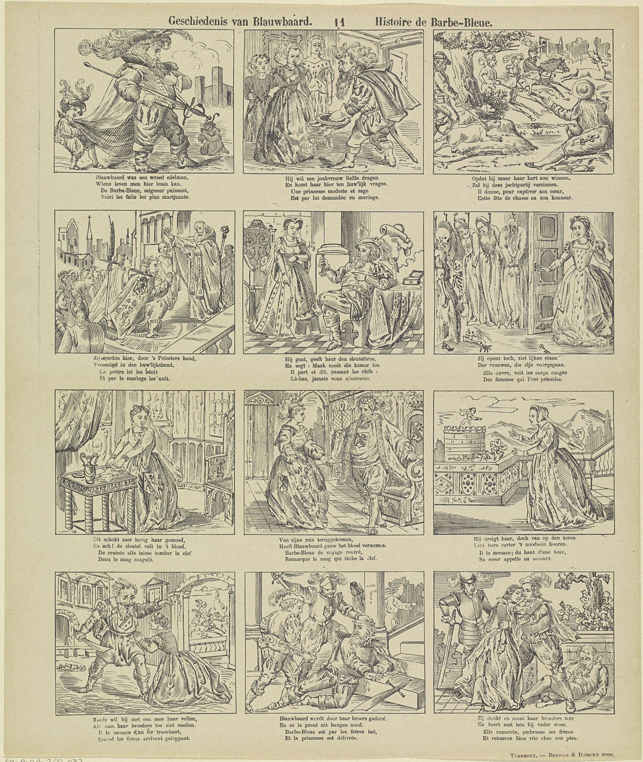 Blad met 12 voorstellingen uit het sprookje van Blauwbaard. Onder elke afbeelding een tweeregelig vers in het Nederlands en in het Frans. Genummerd midden boven: 11.