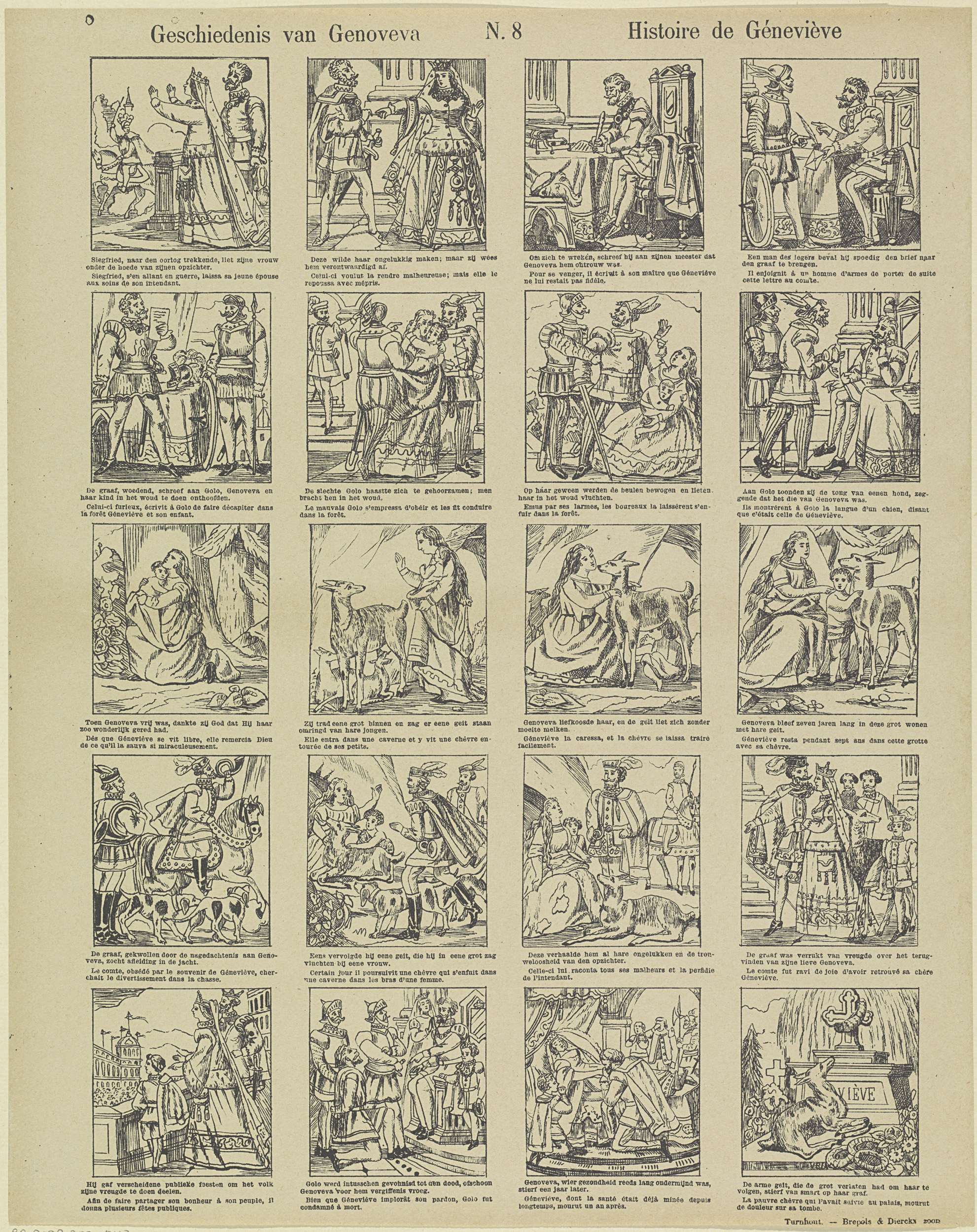 Blad met 20 voorstellingen over het leven van Genoveva van Brabant. Onder elke afbeelding een onderschrift in het Nederlands en in het Frans. Genummerd midden boven: N. 8.