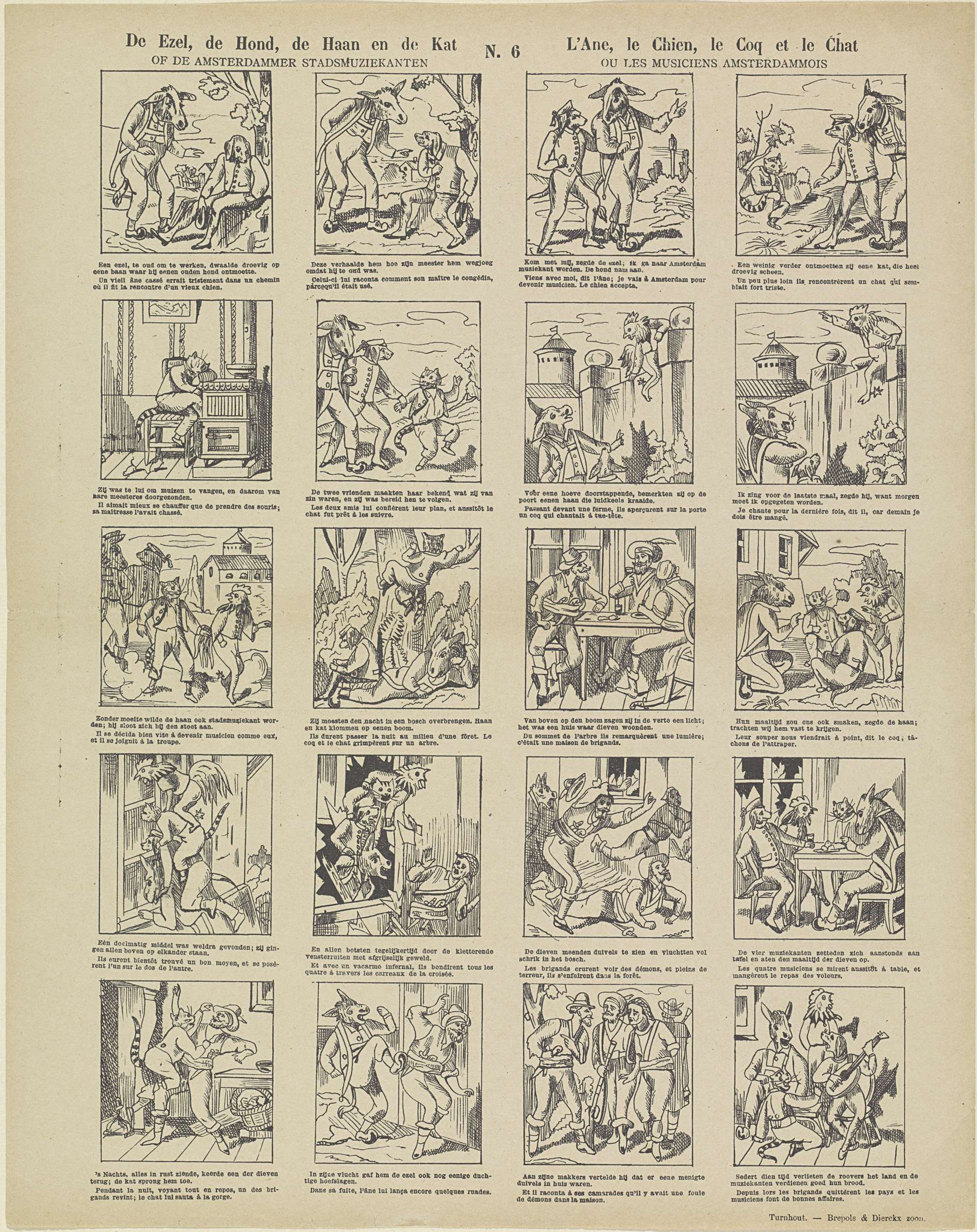 Blad met 20 voorstellingen uit het sprookje van de ezel, de hond, de haan en de kat: de Amsterdammer stadsmuzikanten. Onder elke afbeelding een onderschrift in het Nederlands en in het Frans. Genummerd midden boven: N. 6.