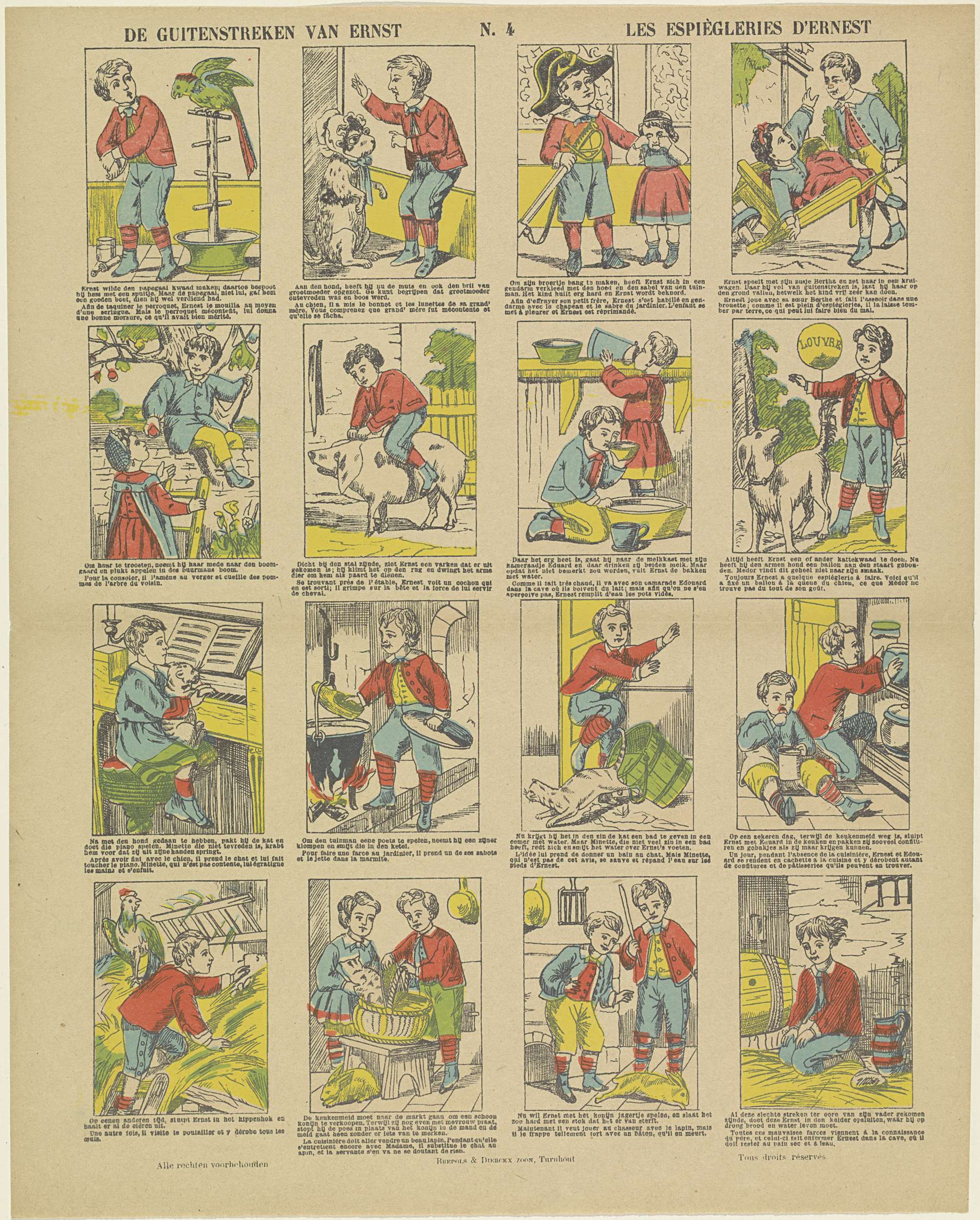 Blad met 16 voorstellingen over Ernest die verschillende streken uithaalt en daarvoor wordt bestraft. Onder elke afbeelding een onderschrift in het Nederlands en in het Frans. Genummerd midden boven: N. 4.