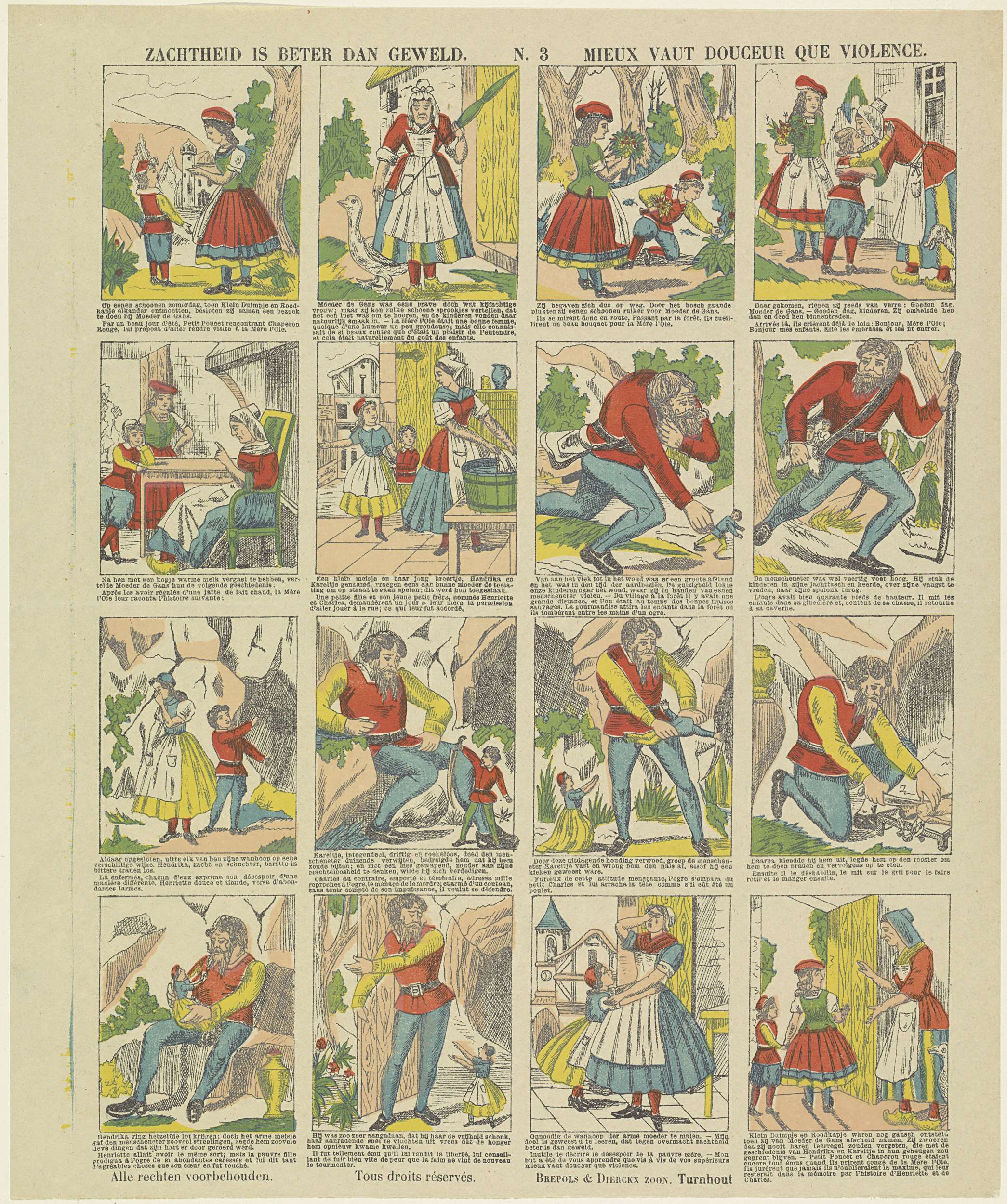 Blad met 16 voorstellingen over Moeder Gans die Roodkapje en Klein Duimpje een verhaal over een mensenetende reus verteld. Onder elke afbeelding een onderschrift in het Nederlands en in het Frans. Genummerd midden boven: N. 3.