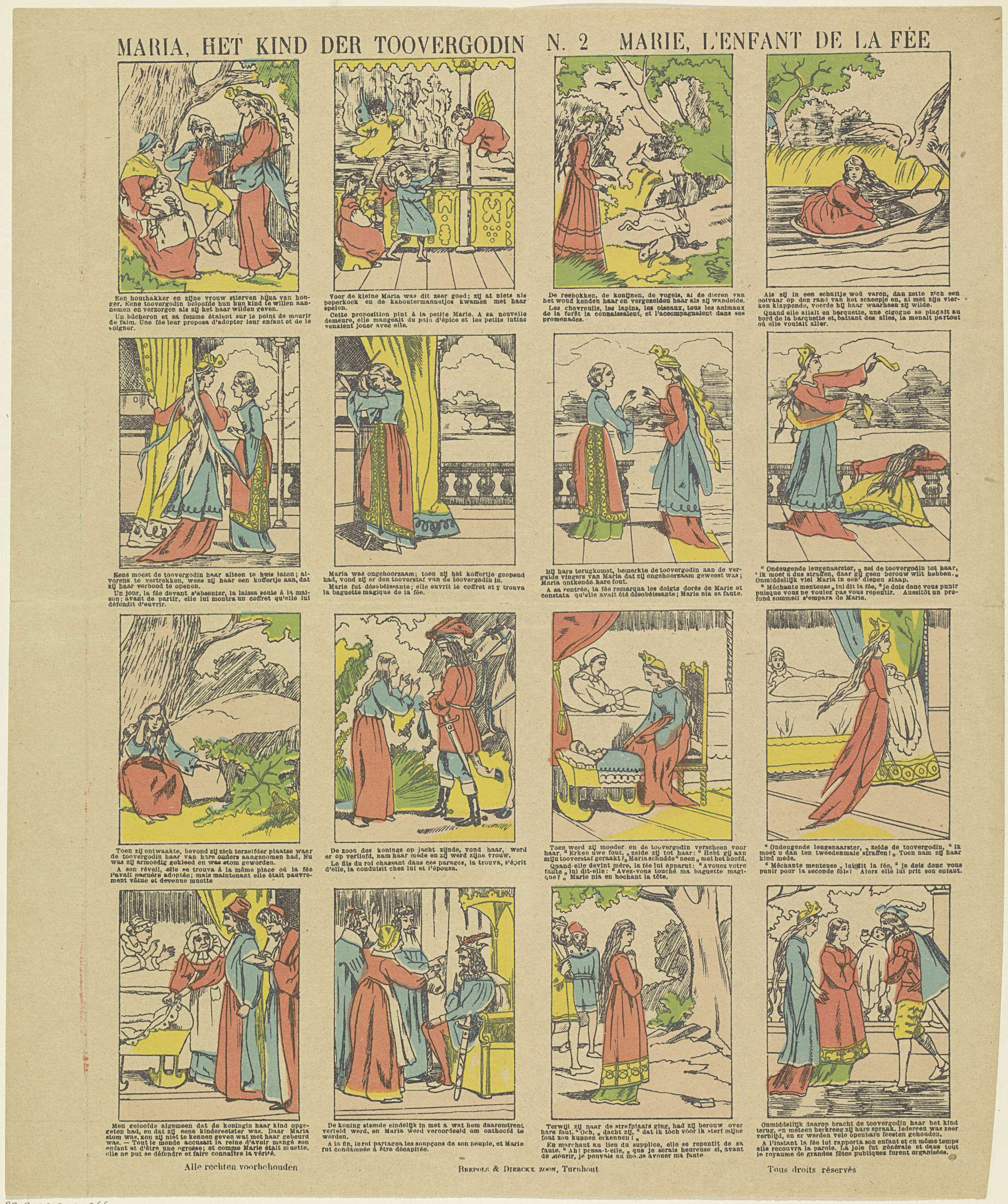 Blad met 16 voorstellingen uit het sprookje van Maria, het kind van een tovergodin. Onder elke afbeelding een onderschrift in het Nederlands en in het Frans. Genummerd midden boven: N. 2.