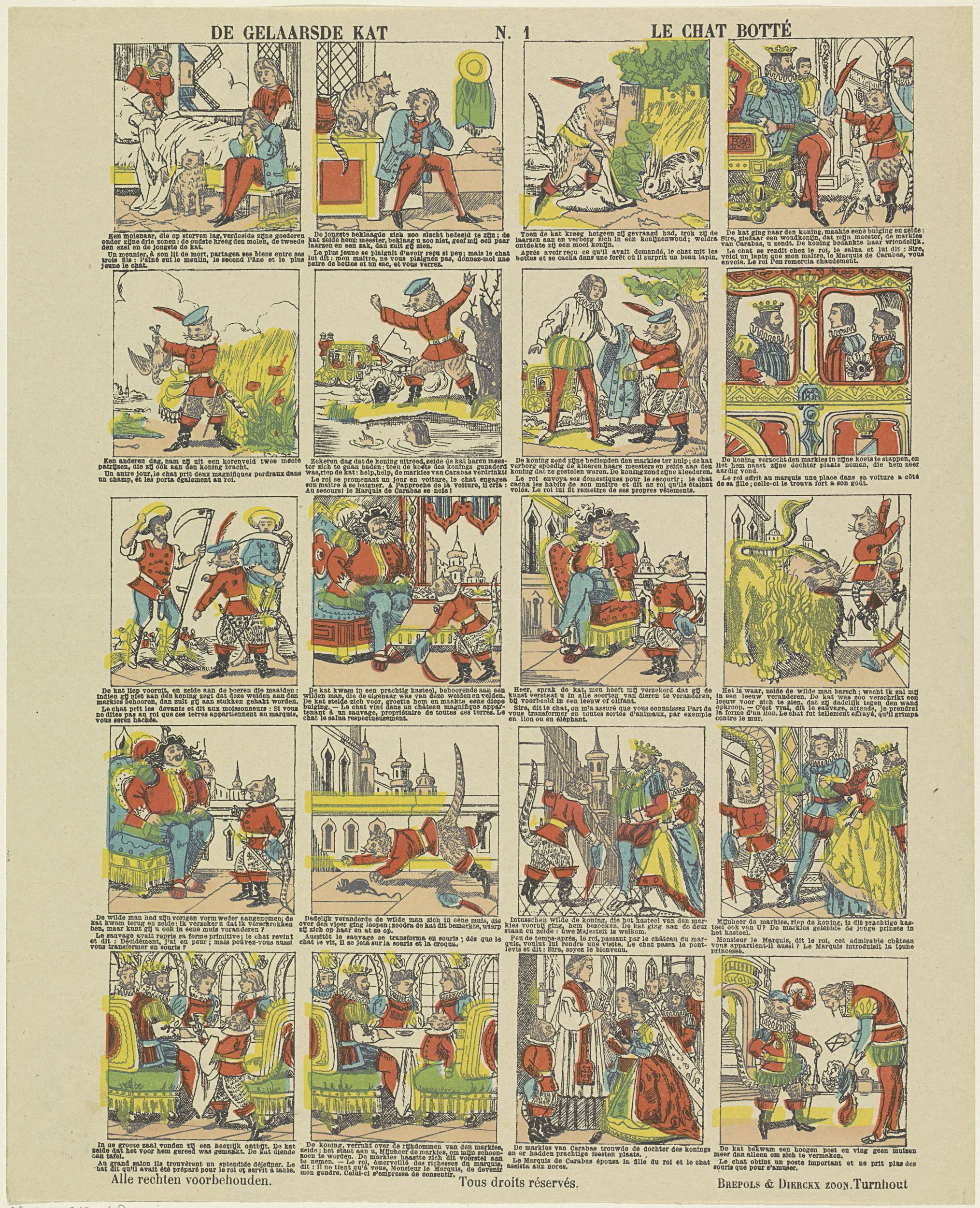 Blad met 16 voorstellingen uit het sprookje van de gelaarsde kat. Onder elke afbeelding een onderschrift in het Nederlands en in het Frans. Genummerd midden boven: N. 1.