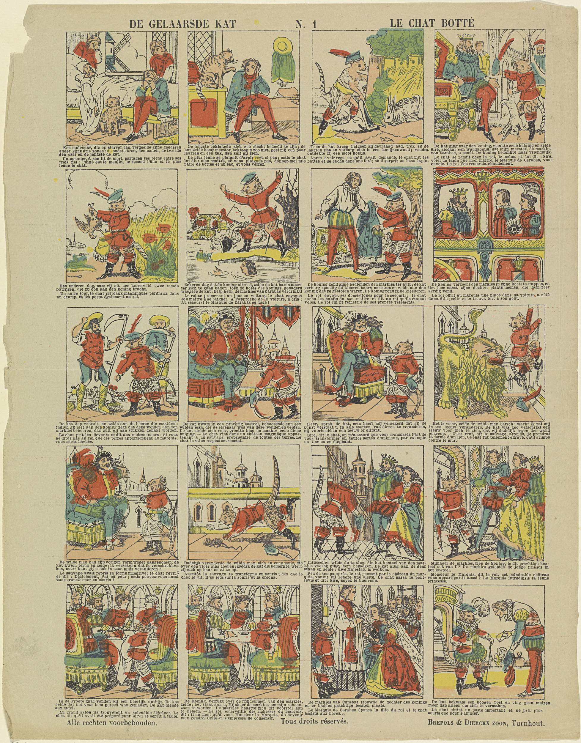 Blad met 16 voorstellingen uit het sprookje van de gelaarsde kat. Onder elke afbeelding een onderschrift in het Nederlands en in het Frans. Genummerd midden boven: N. 1.