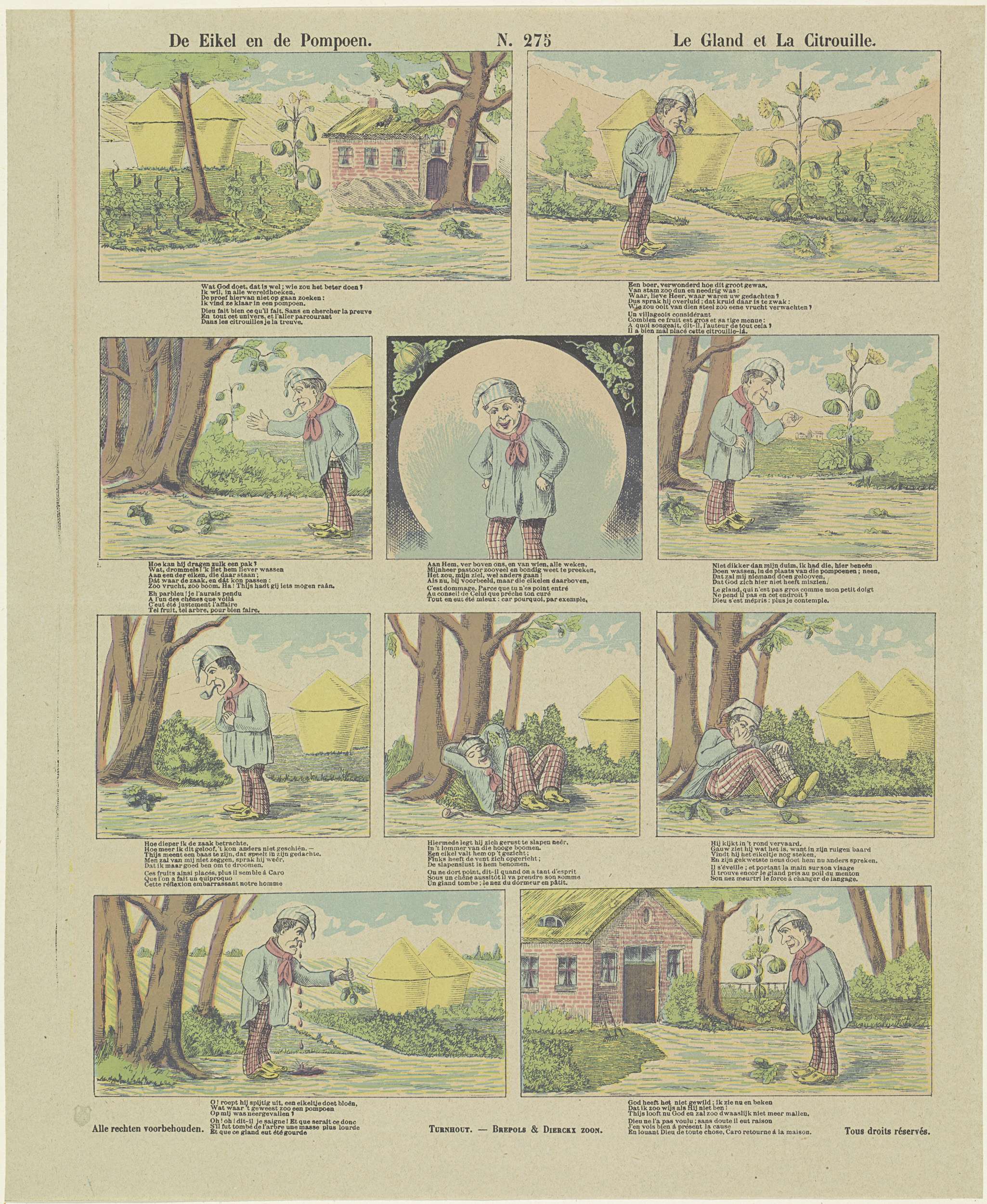 Blad met 10 voorstellingen uit het verhaal van boer Thijs en de eikel en de pompoen. Onder elke afbeelding een onderschrift in het Nederlands en in het Frans. Genummerd midden boven: N. 275.