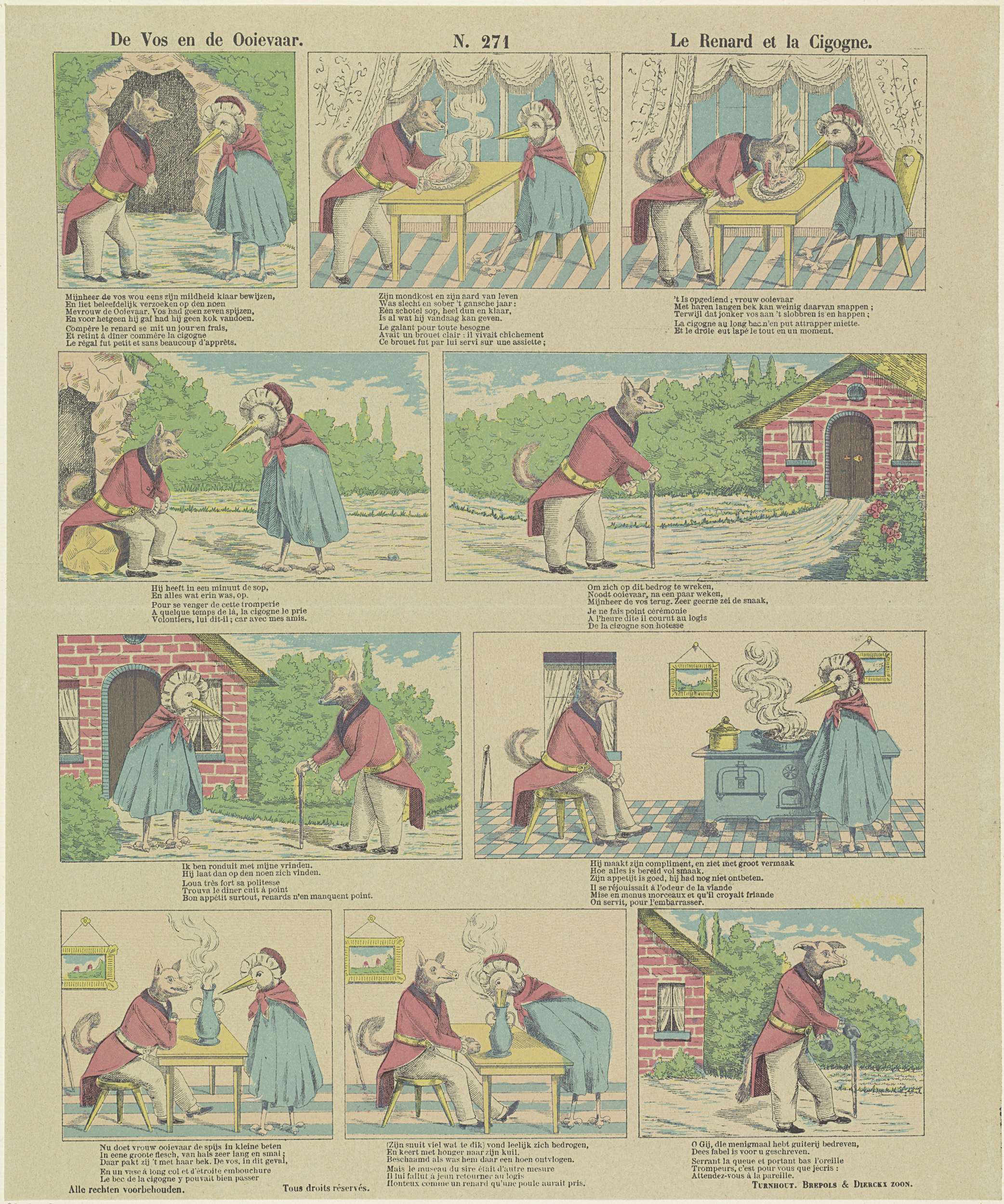 Blad met 10 voorstellingen uit de fabel van de vos en de ooievaar. Onder elke afbeelding een onderschrift in het Nederlands en in het Frans. Genummerd midden boven: N. 271.