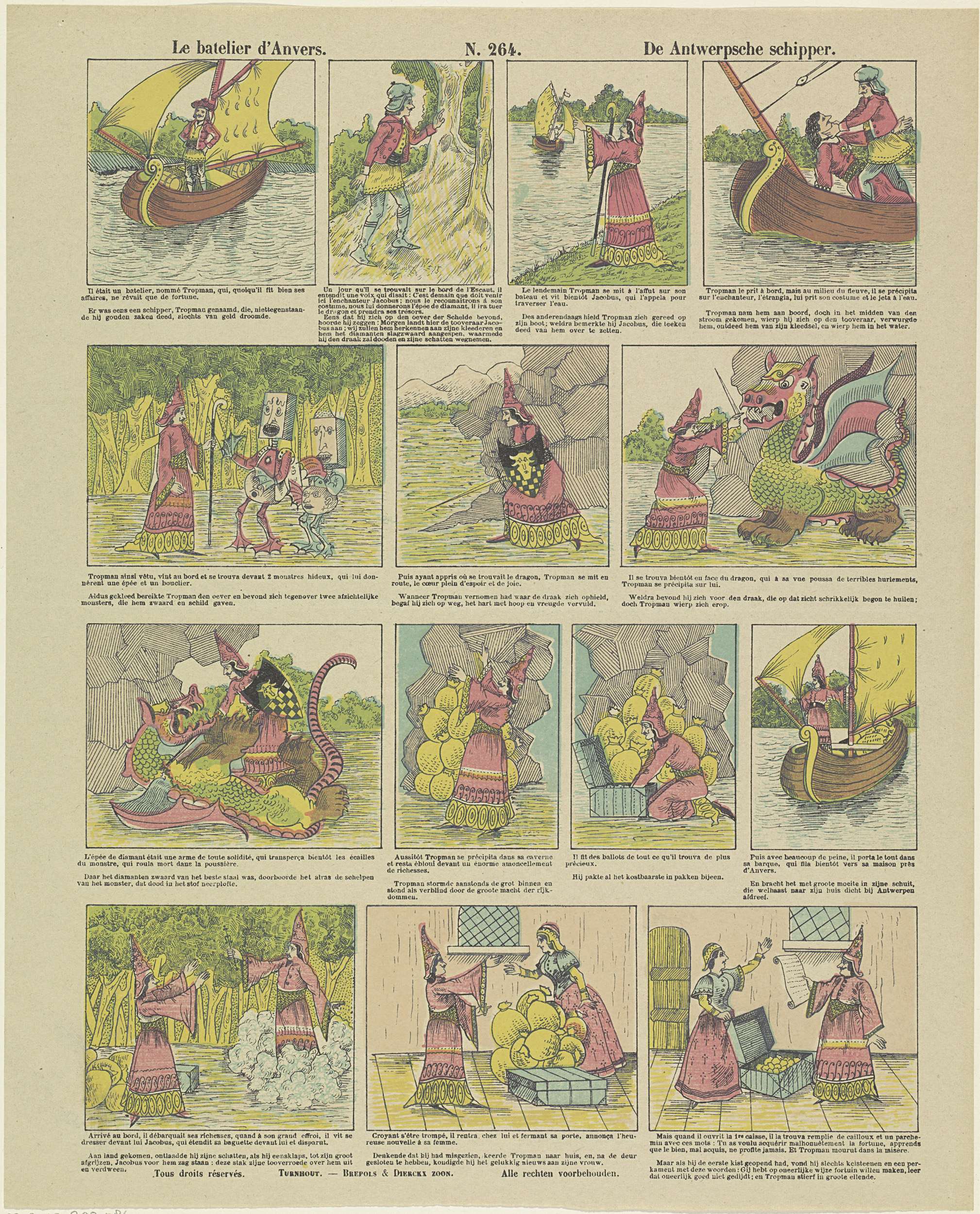 Blad met 14 voorstellingen uit het verhaal over de Antwerpse schipper. Onder elke afbeelding een onderschrift in het Nederlands en in het Frans. Genummerd midden boven: N. 264.