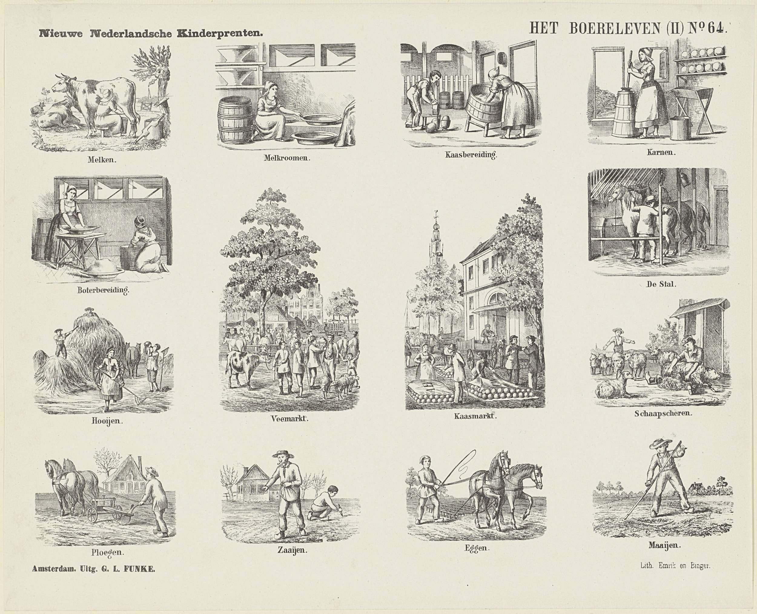 Blad met 14 voorstellingen van boerderijtaferelen, waaronder koeien melken, kaas bereiden, ploegen en schapen scheren. Onder elke afbeelding een onderschrift. Genummerd rechtsboven: No. 64.
