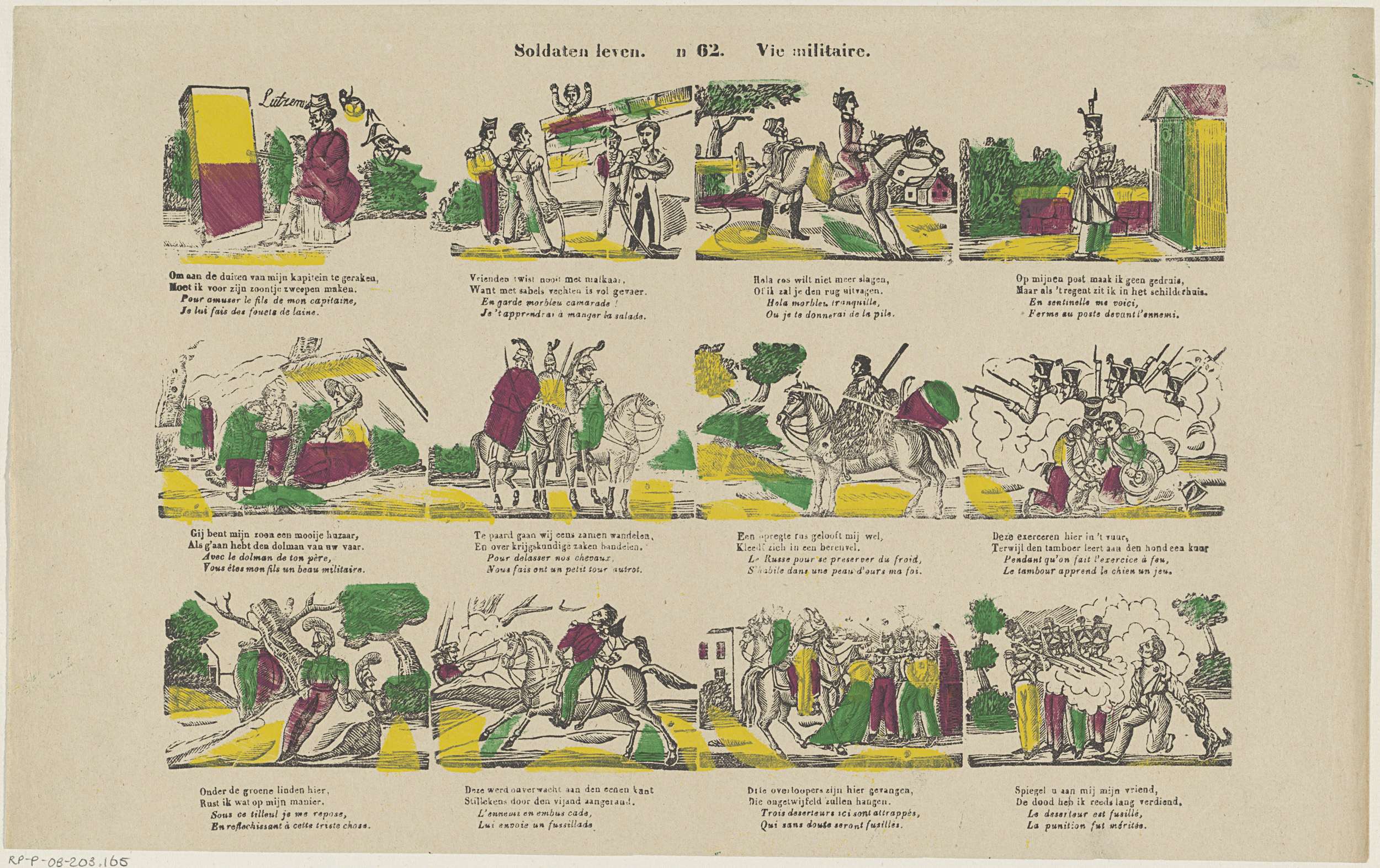 Blad met 12 voorstellingen over het leven van een militair. Onder elke afbeelding een tweeregelig vers in het Nederlands en in het Frans. Genummerd midden boven: n 62.