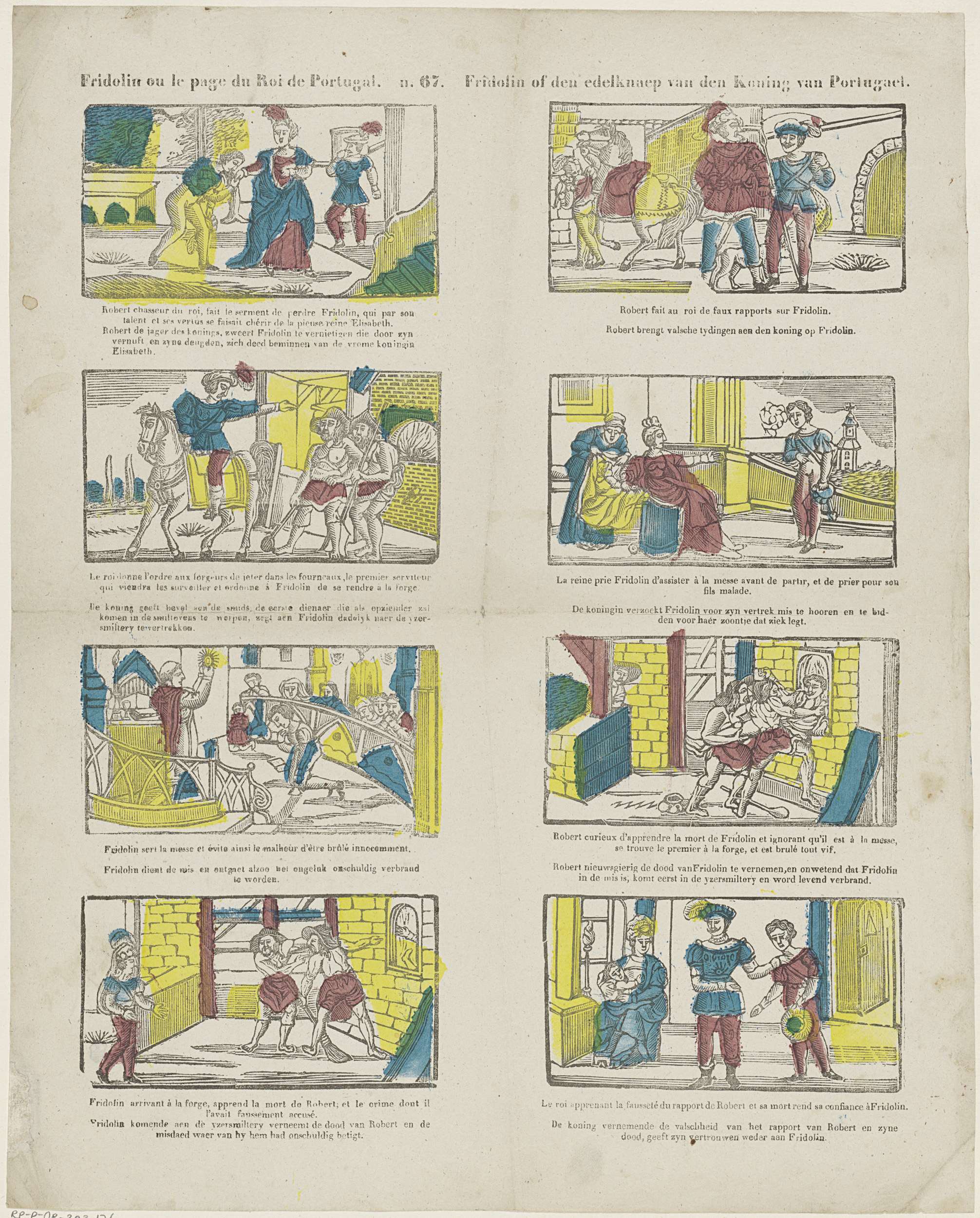 Blad met 12 voorstellingen uit het verhaal van Fridolin, die door Robert vals wordt beschuldigd. De koning van Portugal beveelt de smid de eerste persoon die binnenkomt in de oven te werpen, en stuurt Fridolin naar hem toe. Maar deze ontkomt doordat hij eerst naar de mis gaat. Robert ondergaat Fridolins lot. Onder elke afbeelding ...