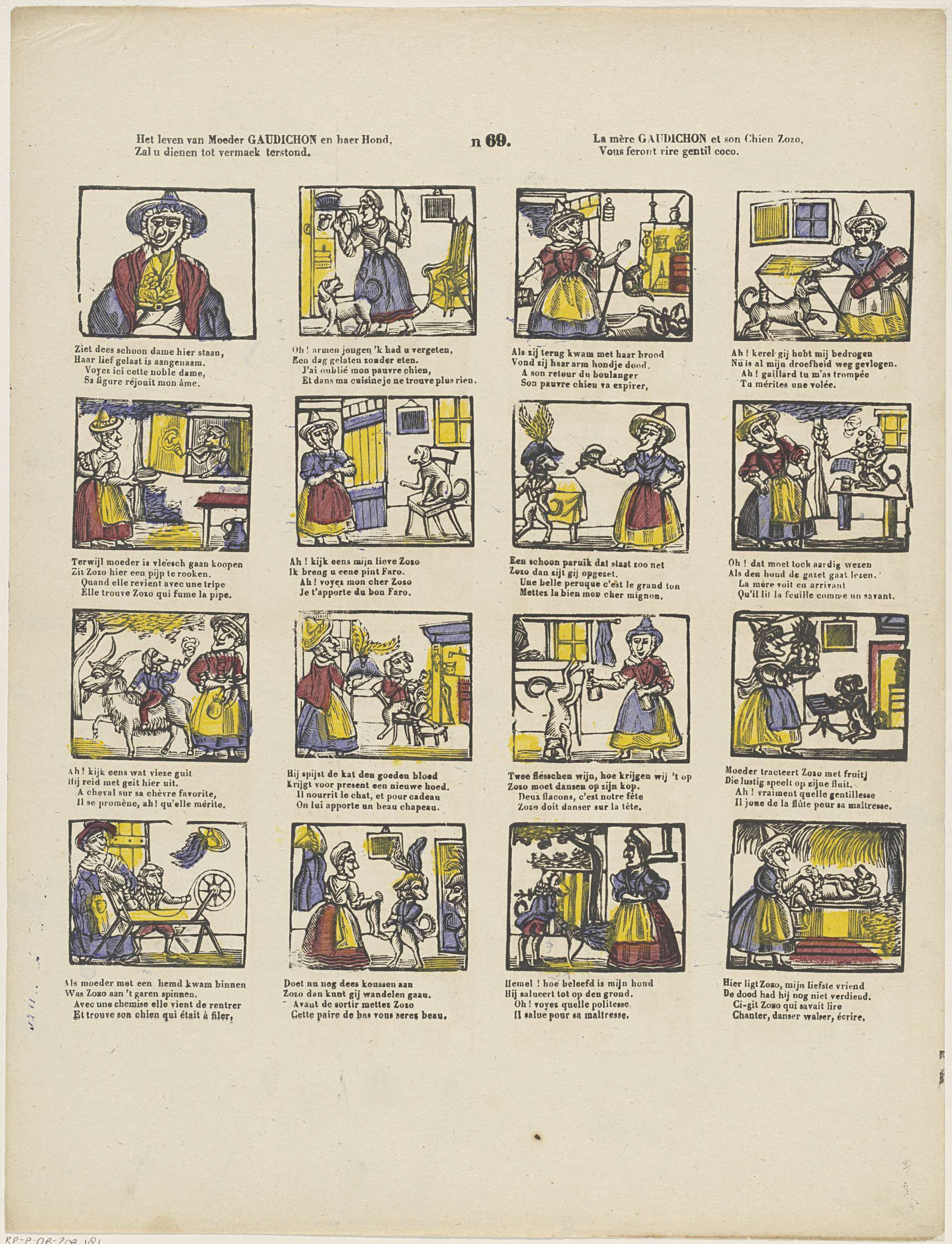 Blad met 16 voorstellingen uit het leven van juffrouw Gaudichon en haar hond. De hond kan allerlei kunstjes, waaronder op zijn kop staan, de pijp roken, op de fluit spelen, spinnen, gekleed gaan met schoenen, broek, jas en steek. Onder elke voorstelling een tweeregelig vers in het Nederlands en het Frans. Genummerd midden boven: n ...