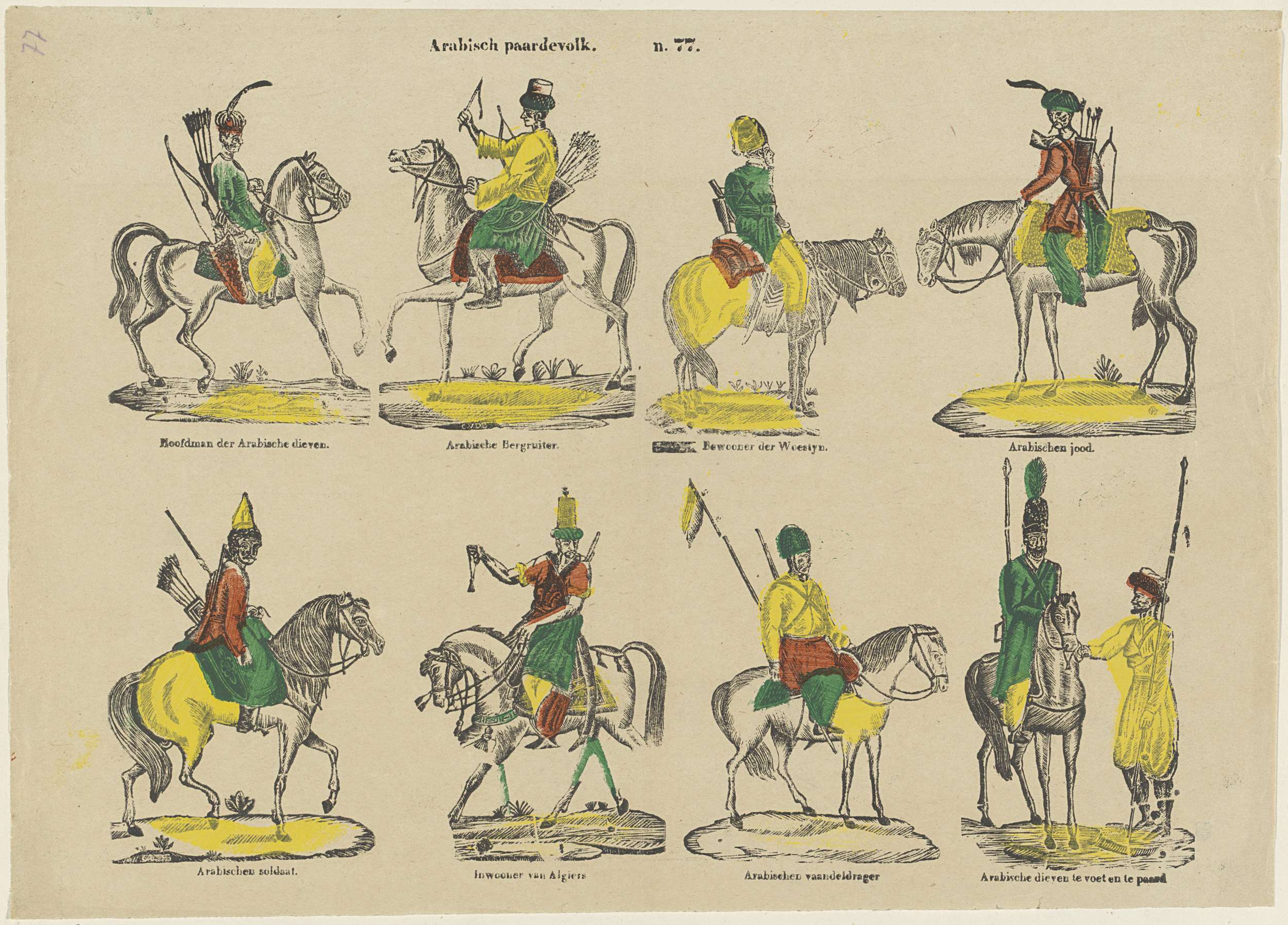 Blad met 8 voorstellingen van Arabische militairen te paard. Onder elke afbeelding een onderschrift. Genummerd midden boven: n. 77.