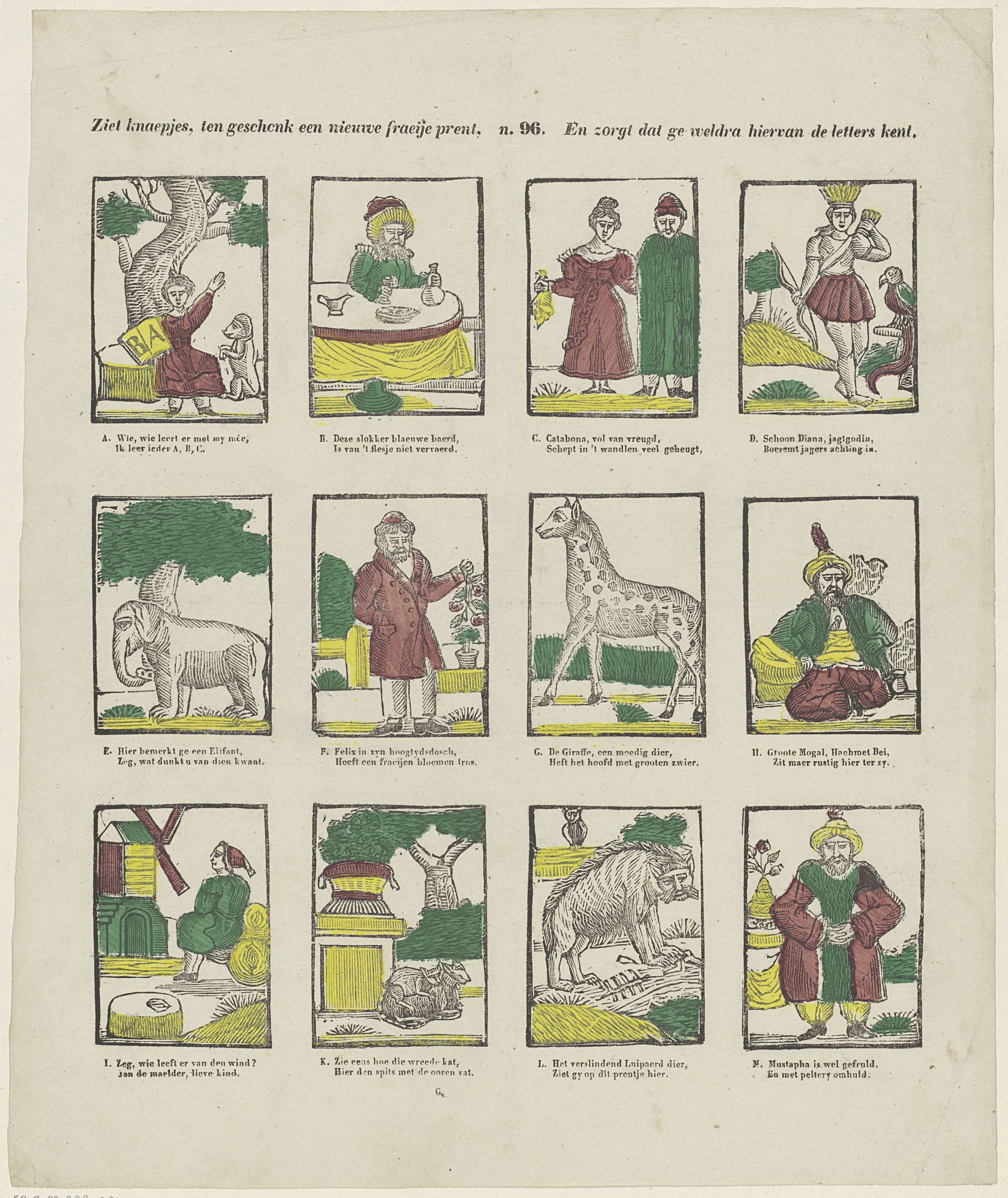 Blad met 12 voorstellingen van de letters van het alfabet (A-M) geïllustreerd met goden, dieren en figuren waarvan de woorden met de betreffende letter beginnen. Onder elke afbeelding een tweeregelig vers. Genummerd midden boven: n. 96.