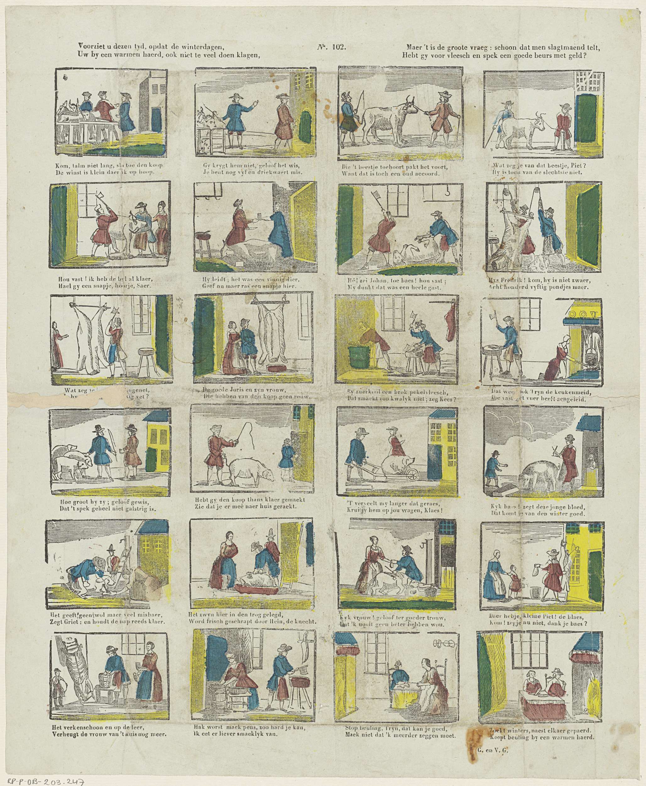 Blad met 24 voorstellingen van het fokken, slachten en bereiden van koeien en varkens (de slachttijd). Onder elke afbeelding een tweeregelig vers. Genummerd midden boven: no. 102.