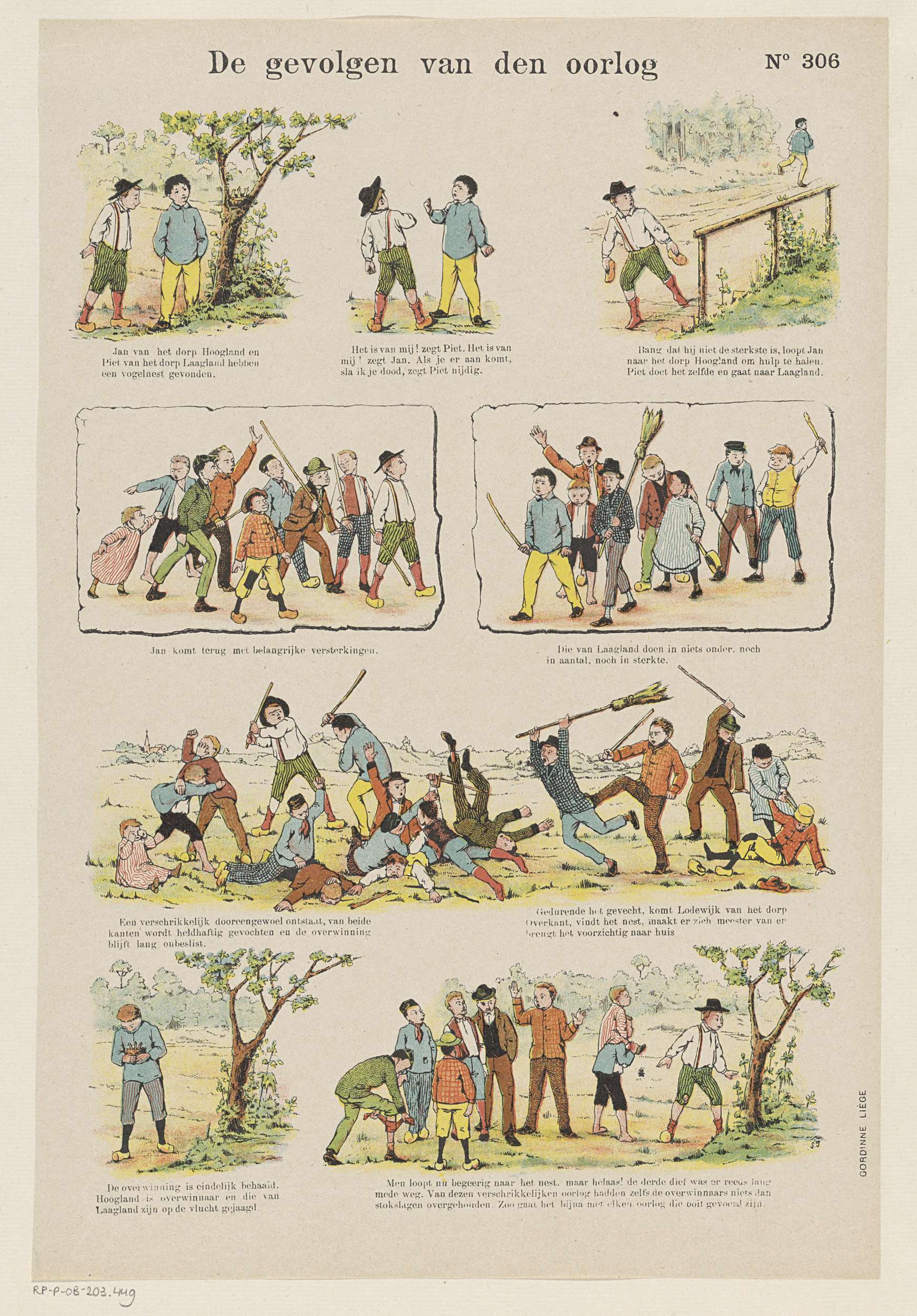 Blad met 8 voorstellingen over twee groepen kinderen die vechten om een vogelnest, terwijl een derde partij er stiekem mee vandoor gaat. Onder elke afbeelding een onderschrift. Genummerd rechtsboven: No 306.