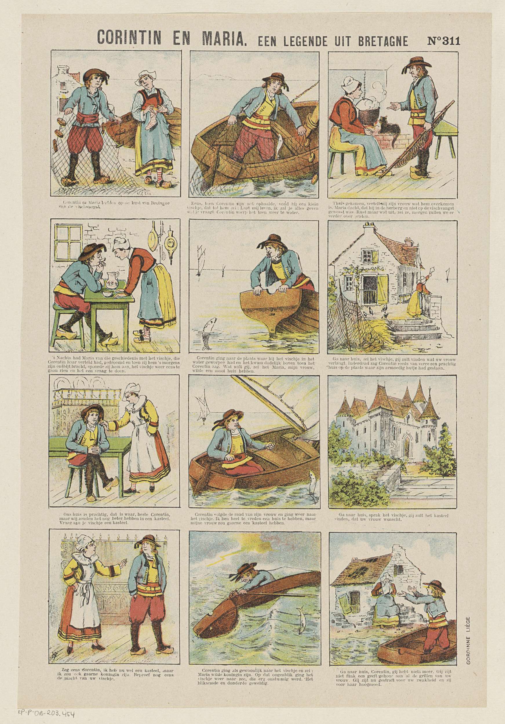 Blad met 12 voorstellingen over een vis die de wensen van Corentin en Maria laat uitkomen. Onder elke afbeelding een onderschrift. Genummerd rechtsboven: No 311.