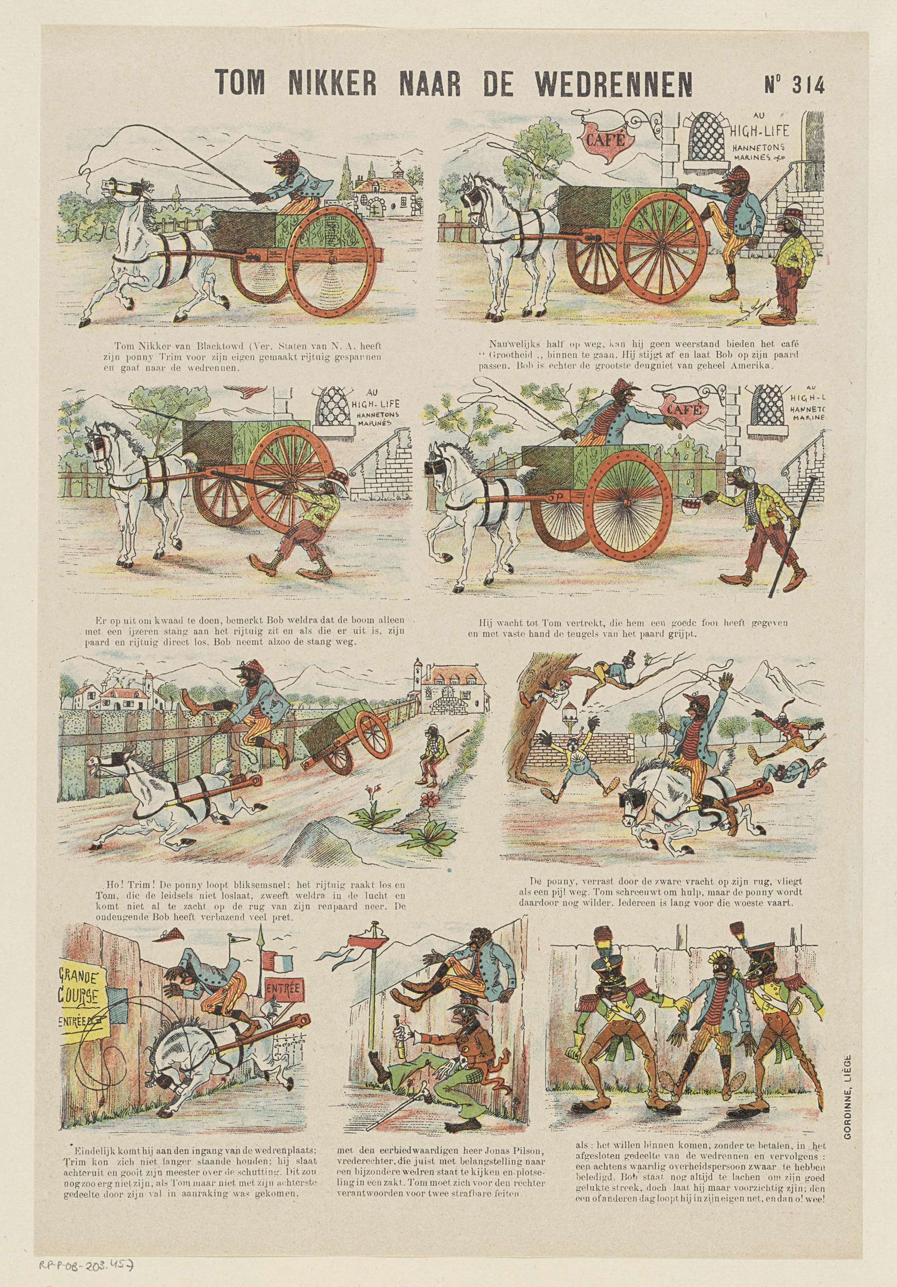 Blad met 9 voorstellingen waarin zwarte Amerikaanse mannen karikaturaal en stereotiep worden voorgesteld. De Amerikaanse 'Tom Nikker van Blacktowd' gaat met zijn paard en rijtuig op weg naar het wedrennen. Onderweg ontkoppelt de deugniet Bob het paard van het rijtuig, waarna het paard met Tom aan de teugels op hol slaat. Onder elke afbeelding een ...