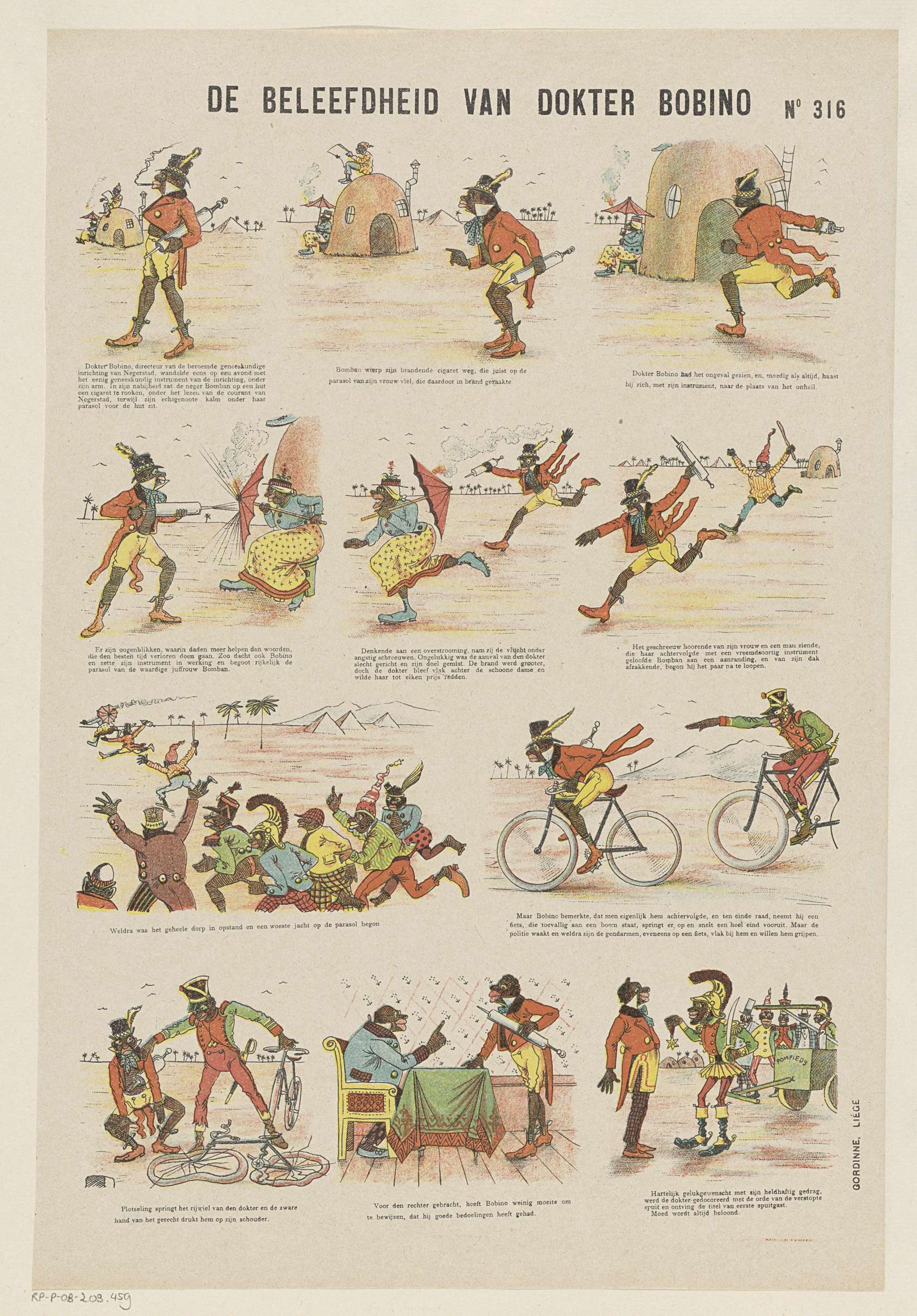 Blad met 11 voorstellingen over dokter Bobino die de brandende parasol van een dame probeert te blussen. Onder elke afbeelding een onderschrift. Genummerd rechtsboven: No 316.