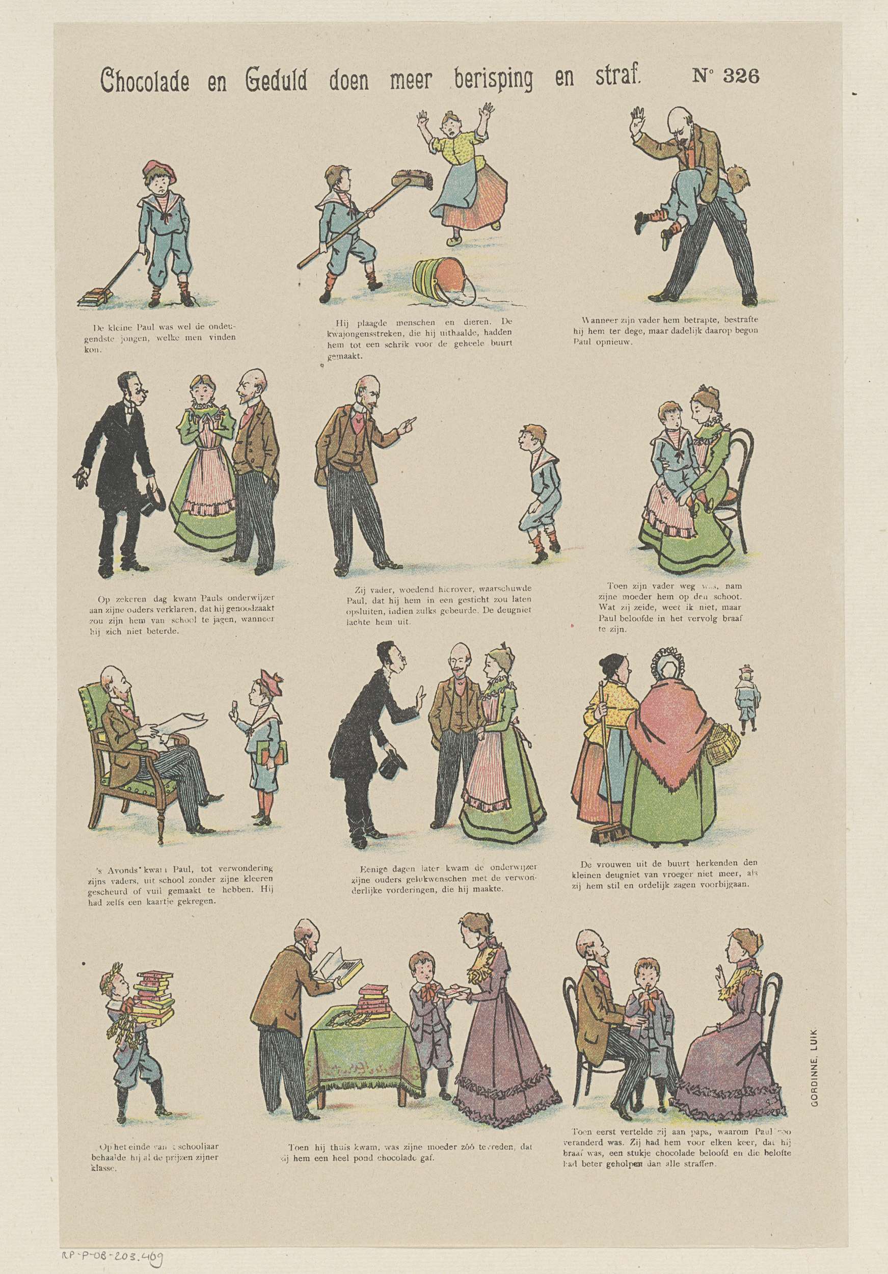 Blad met 12 voorstellingen over de kwajongen Paul die zijn leven betert in ruil voor chocolade. Onder elke afbeelding een onderschrift. Genummerd rechtsboven: No 326.