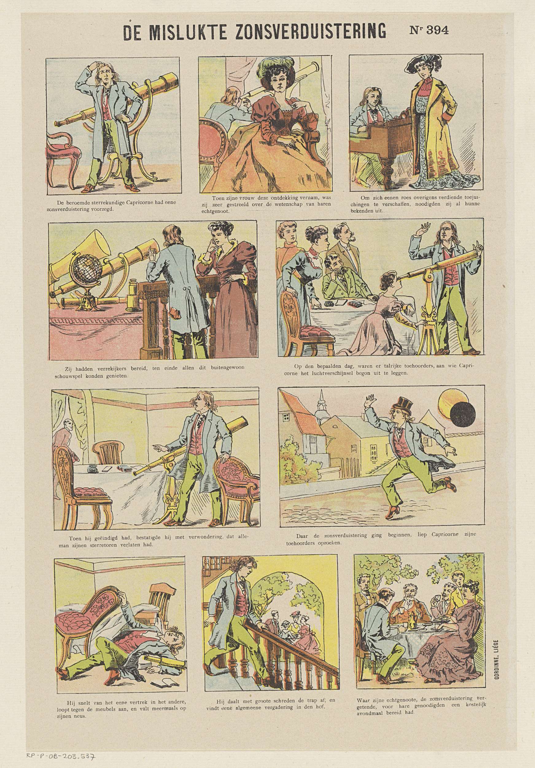 Blad met 10 voorstellingen over een groep mensen die naar een zonsverduistering gaat kijken. Ze vergeten echter te kijken en gaan dineren. Onder elke afbeelding een onderschrift. Genummerd rechtsboven: No 394.