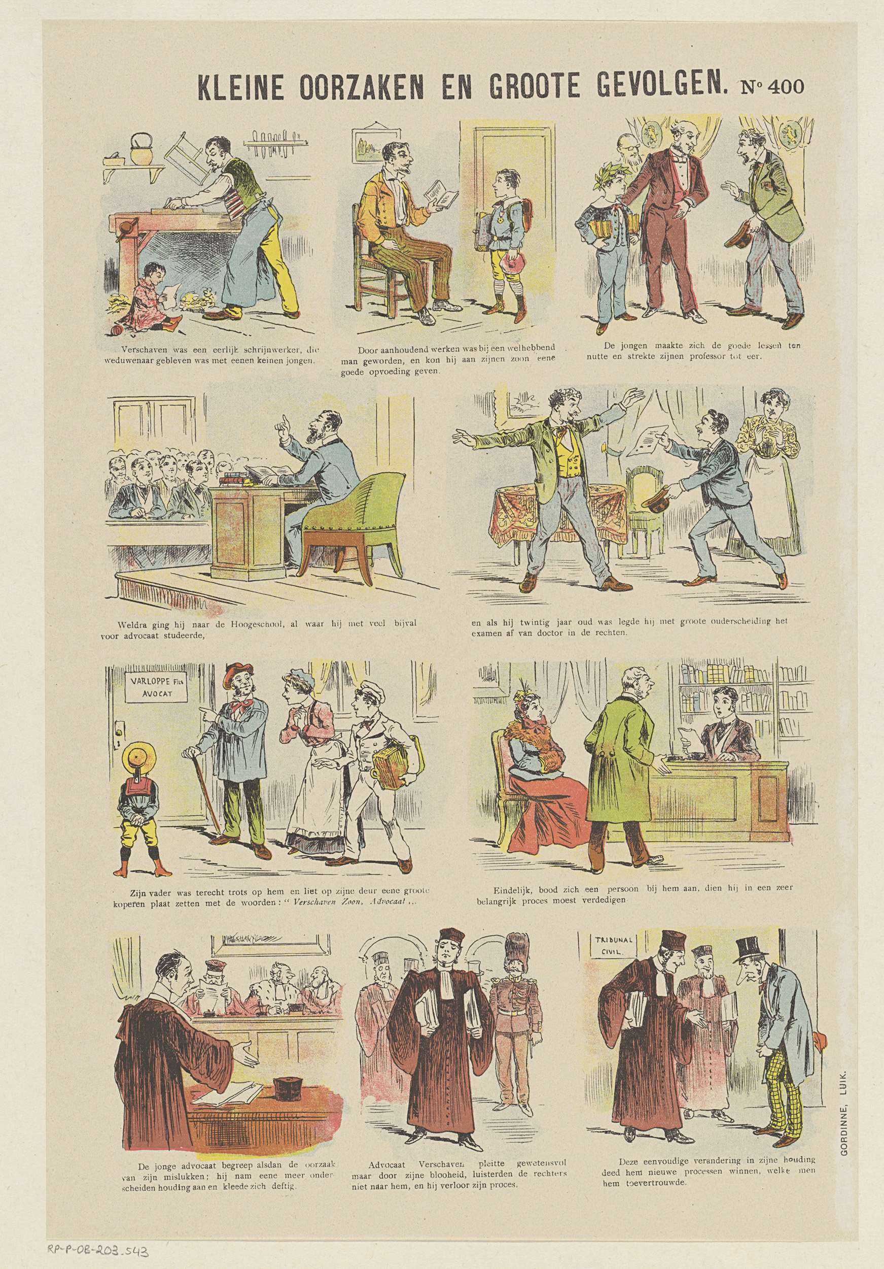 Blad met 10 voorstellingen over een jongen die advocaat wordt. Onder elke afbeelding een onderschrift. Genummerd rechtsboven: No 400.