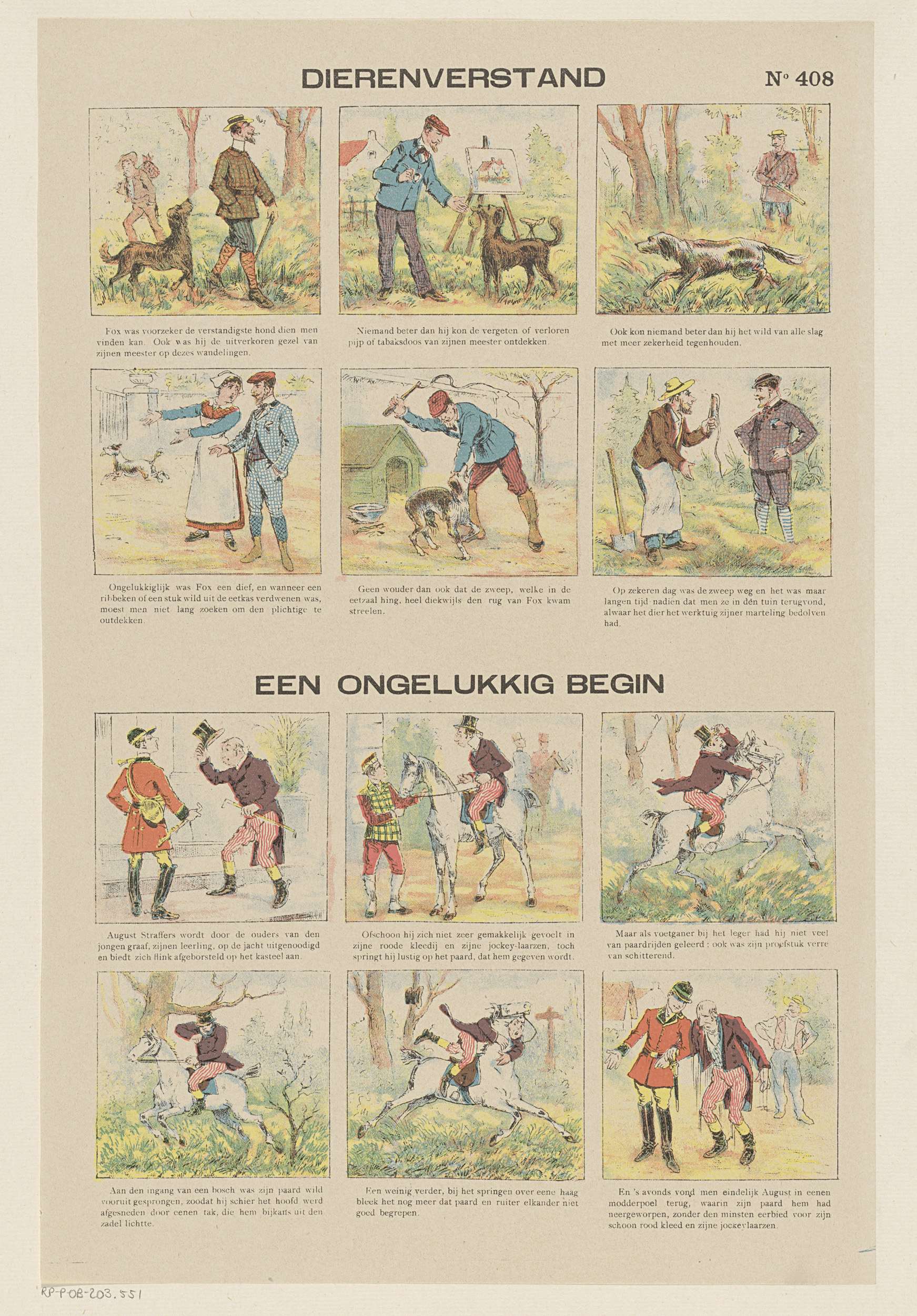 Blad met 12 voorstellingen. Boven zes voorstellingen over een slimme hond. Onder zes voorstellingen over een man die slecht kan paardrijden. Onder elke afbeelding een onderschrift. Genummerd rechtsboven: No 408.