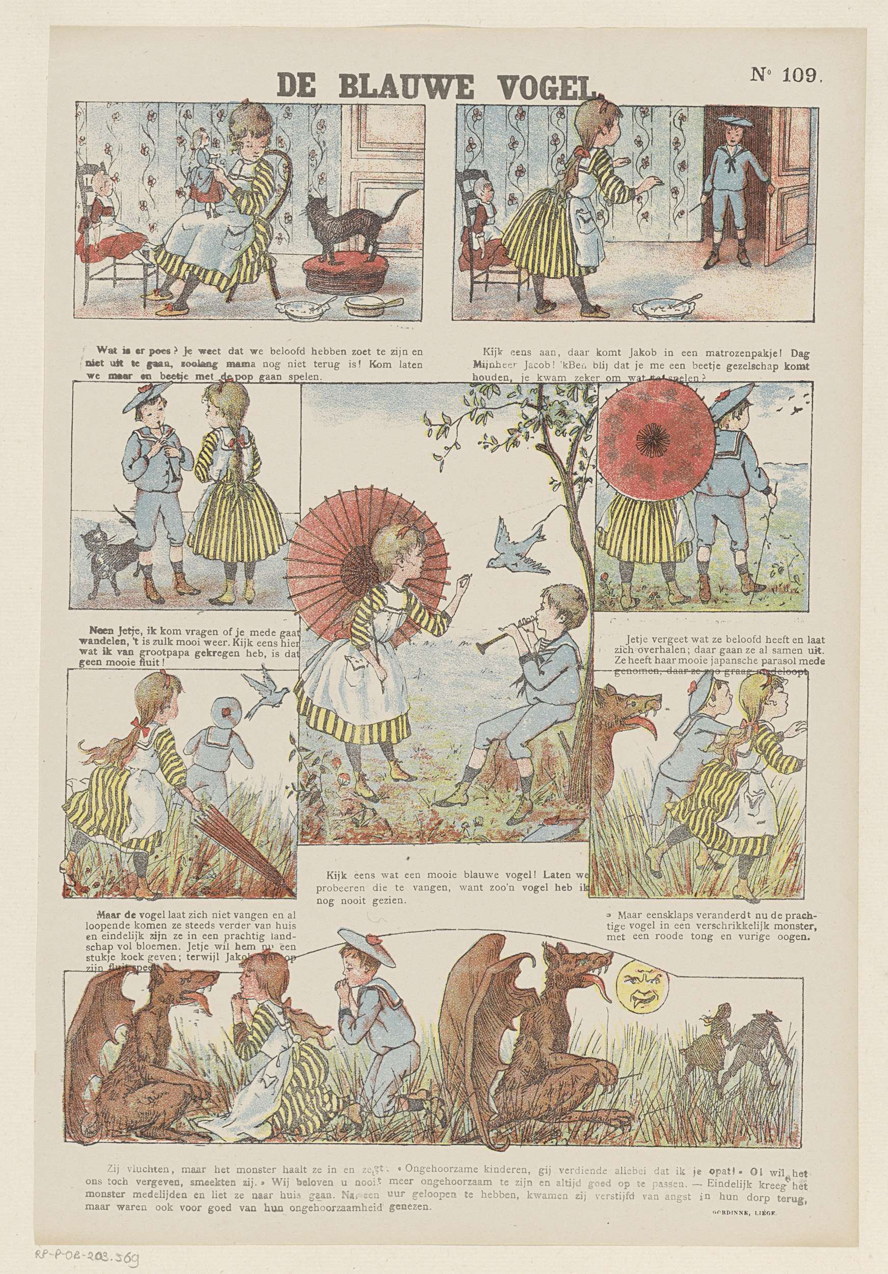 Blad met 8 voorstellingen over twee ongehoorzame kinderen die een vogel achterna zitten. Plotseling verandert de vogel in een monster en leert de kinderen een wijze les. Onder elke afbeelding een onderschrift. Genummerd rechtsboven: No 109.