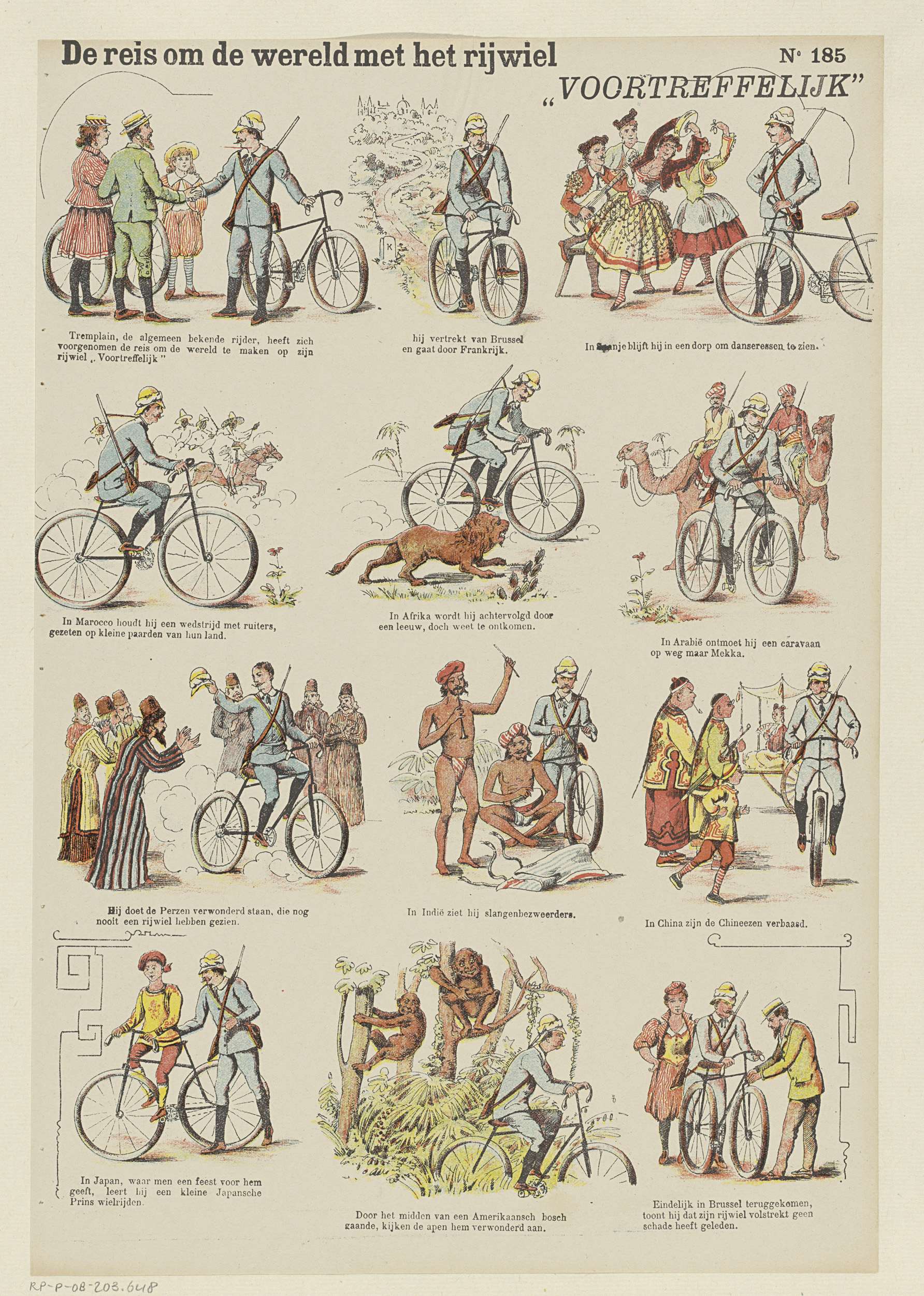 Blad met 12 voorstellingen over meneer Tremplain die een reis om de wereld maakt per fiets. Onder elke afbeelding een onderschrift. Genummerd rechtsboven: No 185.